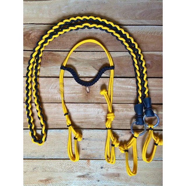 Rédea Com Biqueira Amarela Para Cavalo Aço Inox E Cabeçada De Cordinha O que vem no Produto: Rédea Trançada de Polipropileno Com Argolas de Inox com acabamento fino em charrua dupla; Biqueiras de Polipropileno com nó diamante acabamento fino; Argolas de Inox grandes que não enferruja; Tamanho aproximado: 2,40m com as biqueiras e 2m sem as biqueiras. Rédea super resistente, para todo tipo de uso, super macia e bem trabalhada artesanalmente Cabeçada de Poli Traia Artesanal Na cor preto com vermelho Envio é imediato! Para mais cores Chamar no Chat