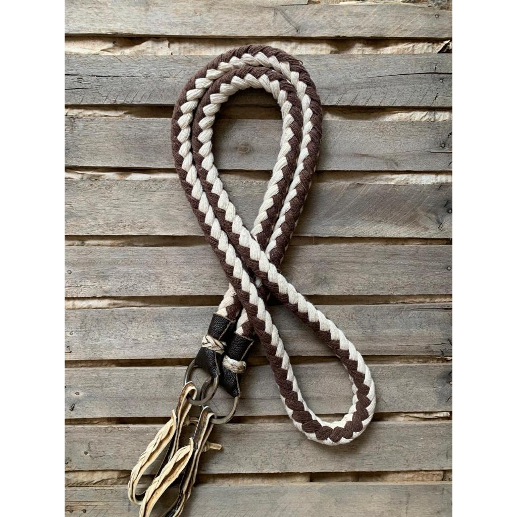Rédea confeccionada em lã, trançada a mão Possui argolas em aço inox, livre de ferrugem Acompanha um par de biqueiras em couro crú Produto com excelente acabamento, muito macio resistente