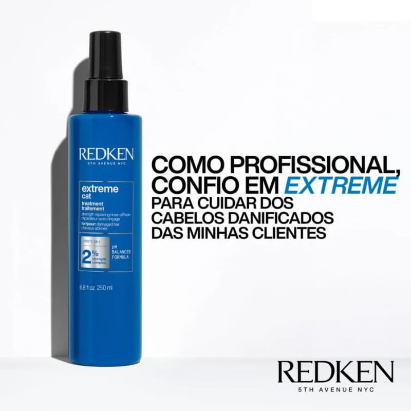 LEAVE IN EXTREME CAT REDKEN 250ML Tratamento capilar para cabelos danificados. Redken Extreme Cat Tratamento Reconstrutor com proteína líquida que fortalece e recupera danos na fibra. Redken Extreme Cat Tratamento Reconstrutor é um tratamento que age como reconstrutor capilar e fortalecedor para cabelos danificados e sensibilizados. Sua fórmula avançada tem o poder de restaurar e recuperar os fios severamente danificados. Sua embalagem em spray, é de fácil aplicação e não deixa seu cabelo pesado. MODO DE USAR: Após utilizar o Shampoo Redken Extreme, retire o excesso de água. Aplique o tratamento reconstrutor uniformemente sobre os fios. Deixe atuar de 3 a 5 minutos e depois enxágue. Quando o cabelo necessitar de mais força antes de um processo de coloração, aplique o tratamento reconstrutor, deixe atuar por 5 minutos e lave com água. Termine com o condicionador apropriado. Seque o cabelo e comece a aplicação da coloração. RESULTADO: Interlock Protein Network: Com um sistema de proteínas, fortalece a estrutura capilar interna, aumentando sua resistência para reduzir a quebra dos fios. FC Complexo Fortalecedor: Composto pela tecnologia 18-MEA e Ceramidas, repara a estrutura dos cabelo danificado e serve de apoio para a rede de proteínas reconstrutoras Interlock. Além disso, forma um filme protetor e de brilho ao redor de cada fio. Cabelo revitalizado, forte, resistente e com brilho.