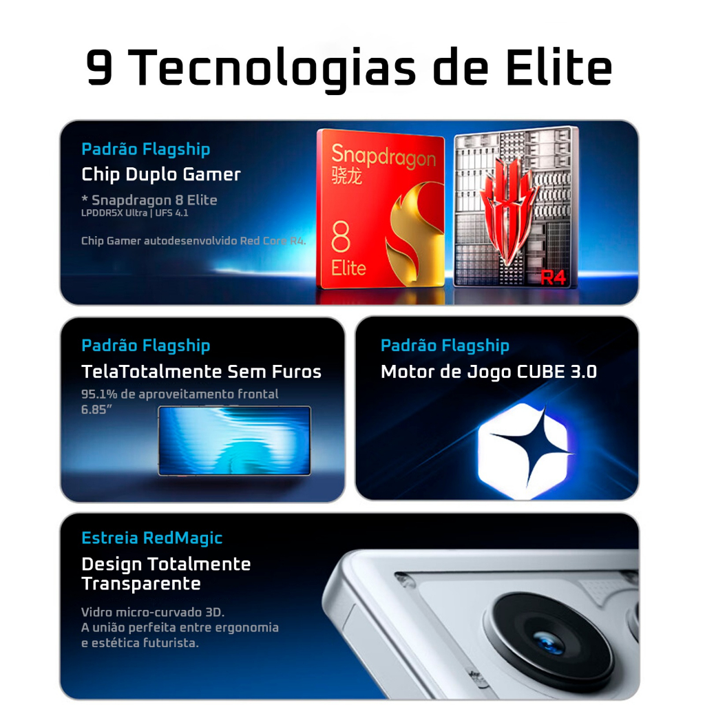 POR FAVOR, CONSULTE OS ESTADOS DISPONÍVEIS PARA ONDE FAZEMOS ENVIO (NÃO FAZEMOS ENVIOS PARA NORDESTE) CONTEÚDO DA CAIXA ORIGINAL 1* REDMAGIC 11 Air 1* Cabo de carregamento rápido Tipo-C 1* Carregador original padrão BR de 80W 1* Cartão de informações de segurança e garantia 1* Protetor de tela anti-impressão digital e antipoeira pré-instalado (não é protetor) 1* Capa transparente pré-instalada 1* Ferramenta para ejeção da bandeja do SIM RECURSOS Projetado para ser diferente Criado com um design transparente, vibrante, fino e leve para uma estética futurista e confortável. Desempenho ainda melhor Equipado com Snapdragon 8 Elite e REDMAGIC RedCore R4 para jogabilidade mais fluida e sem travamentos, e até 16 GB de RAM e 512 GB de armazenamento. Uma lufada de ar fresco Mantenha a temperatura ideal com uma ventoinha turbo de fluxo de ar ativo, uma câmara de vapor otimizada maior e camadas de grafeno. Vença por mais tempo Bateria de 7000 mAh e carregamento rápido de até 80 W para energia de longa duração. Uma vitória mais clara à vista Desfrute de uma tela completa sem notch com taxa de atualização de 144 Hz para visuais nítidos e claros. Jogando no ar Os icônicos gatilhos laterais de 520 Hz, o REDMAGIC OS 11.0 mais fluido e recursos avançados do Game Space, como espelhamento de jogos, garantem uma experiência de jogo ultrarresponsiva e inteligente. Capture a Excelência A câmera principal de 50 MP com OIS oferece detalhes mais nítidos, melhor desempenho em baixa luminosidade e cenas mais amplas com uma lente ultra grande angular e algoritmos inteligentes de IA. Divirta-se ao máximo, viva com inteligência O 5G garante conectividade rápida, enquanto o NFC, o controle por infravermelho e a IA Google Gemini facilitam as tarefas do dia a dia. Dê um novo fôlego à sua rotina Potencialize seu dia com recursos de IA aprimorados, jogabilidade melhorada e multitarefa perfeita. Acabe com a areia Desfrute de precisão e controle inteligente em todos os níveis do jogo. Gatilhos laterais de toque duplo de 520Hz Uma taxa de amostragem de toque de 520Hz, líder do setor, garante latência ultrabaixa e resposta precisa para operações complexas. Cada entrada recebe uma resposta instantânea, dando a você a vantagem em todas as partidas decisivas. Sistema Operacional REDMAGIC 11.0 Com um sistema operacional otimizado para jogos que equilibra estabilidade e fluidez, a interface do usuário e os controles permanecem responsivos mesmo sob cargas pesadas, garantindo uma jogabilidade suave e ininterrupta. Seu novo Espaço de Jogo O Espaço de Jogo aprimorado coloca desempenho, controle e assistência inteligente ao seu alcance, permitindo que você ajuste as configurações e personalize cada jogo para se adequar ao seu estilo. Aprimore suas habilidades com nosso Treinador Tático Pessoal para jogos como MLBB, Free Fire e PUBG, enquanto o Controle de Voz e a Voz da Mora otimizam sua comunicação em todas as partidas. Modo Caçador Use filtros visuais para destacar os inimigos e obter uma clara vantagem no campo de batalha. Voz da Mora Seu assistente com inteligência artificial pode analisar as conversas do jogador e se comunicar no jogo usando a Voz da Mora. Linha Auxiliar Aprimore a precisão dos tiros permitindo que os jogadores definam pontos de referência na tela. Gatilho de IA Ative ações automáticas para uma jogabilidade instantânea e responsiva. Mira Personalizada Ative o uso de miras personalizadas em jogos de tiro para melhorar a precisão da mira. Controle de Movimento Proporciona uma jogabilidade intuitiva mapeando os movimentos físicos do dispositivo para ações na tela. Inclinar para a esquerda, inclinar para a direita, levantar a lateral esquerda ou direita, levantar a parte superior ou inferior, tudo se traduz perfeitamente em toques no jogo, oferecendo uma nova dimensão de controle. Modo Host Conecta dispositivos de jogos REDMAGIC, como smartphones e tablets, como uma tela de jogo secundária para visualização aprimorada, operações mais rápidas e recursos expandidos para melhorar a experiência de jogo. Gravação Flexível Captura com precisão os momentos do jogo gravando para frente ou para trás, permitindo também que os jogadores personalizem a NOTAS IMPORTANTES 1. Fatores externos e aplicativos em execução podem afetar a velocidade de transmissão de dados e o funcionamento da tela; a experiência pode variar para cada usuário. 2. O desempenho do dispositivo pode ser afetado por condições externas. 3. A qualidade da rede local pode afetar a velocidade do Wi-Fi. 4. As imagens são meramente ilustrativas; o produto real pode variar. 5. Todos os dados são fornecidos pela REDMAGIC Labs.