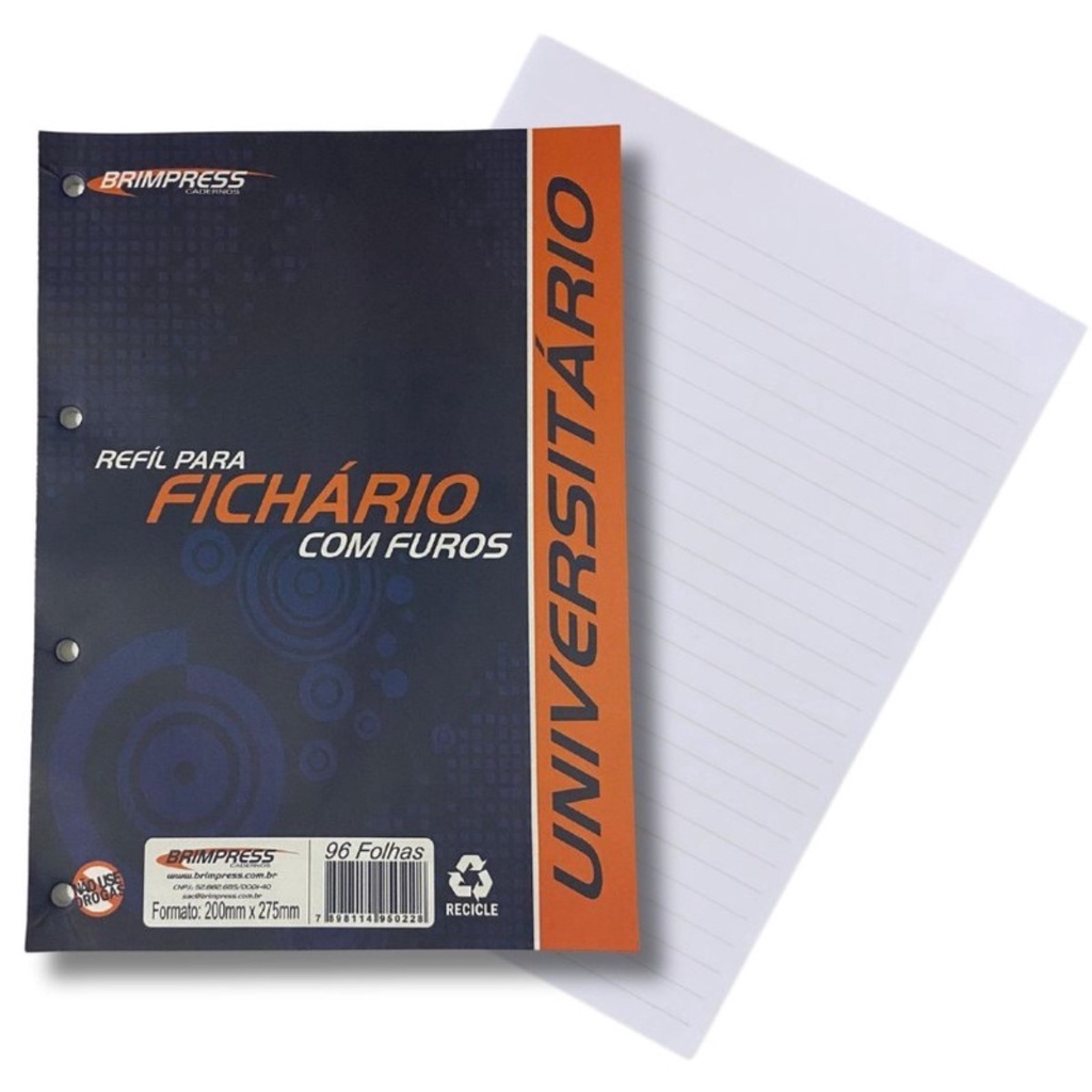 O Refil para Caderno Argolado Universitário Brimpress 288 Folhas possui folhas pautadas coladas e linhas pretas. Ideal para o dia a dia na escola ou na faculdade. Detalhes Capa: flexível Folhas: coladas e pautadas Miolo Produto certificado: FSC® Formato: 200mm x 275mm Gramatura: 56 g/m² Número de folhas: 288 folhas