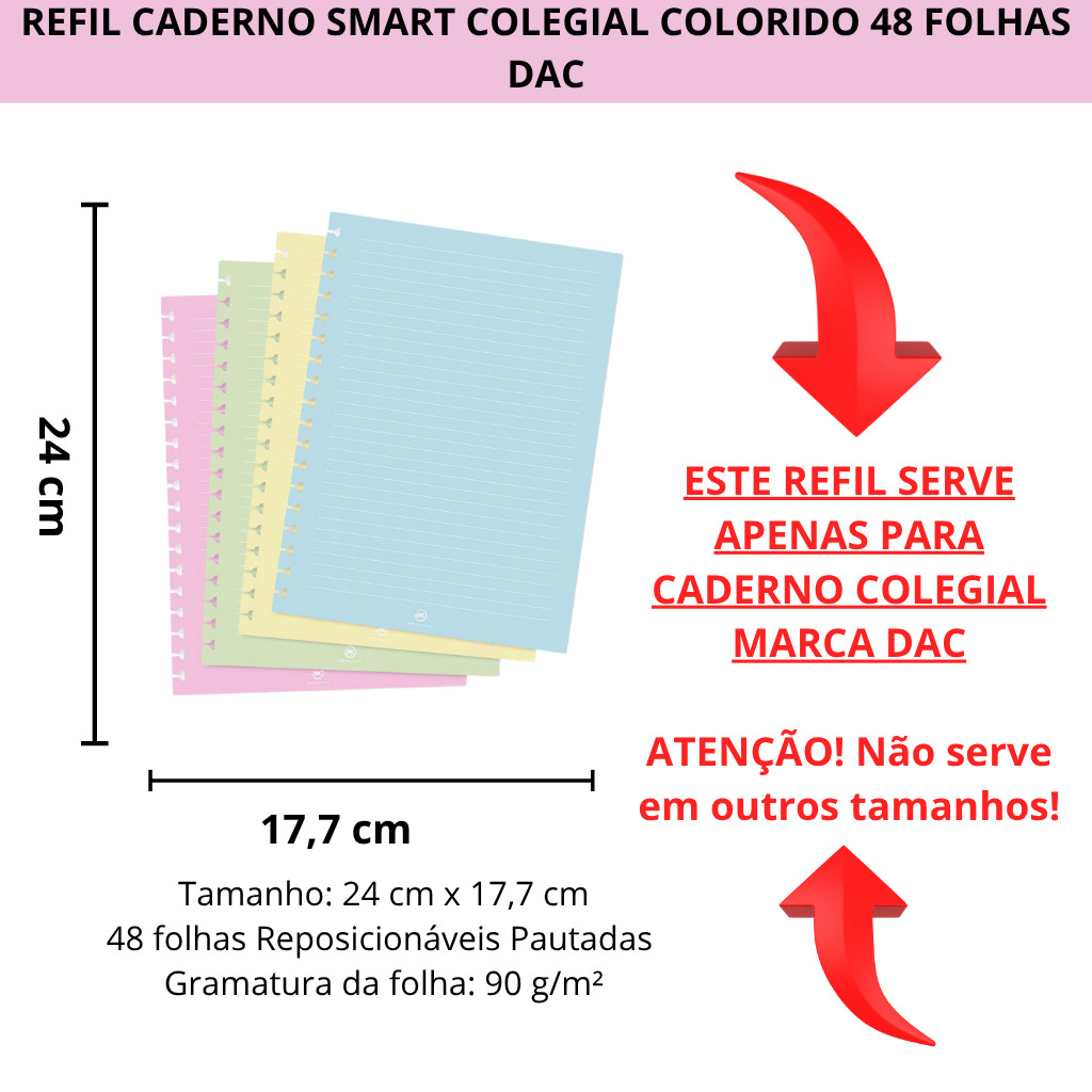 Refil Caderno Smart Colegial Enjoy 48 Folhas Colorido DAC O Refil Caderno Smart Colegial DAC é compatível com todos os cadernos smart tamanho Colegial sendo o produto perfeito para quem busca qualidade e conforto na hora de escrever. Este refil vai com 48 folhas coloridas pautadas. O papel tem gramatura (90GR), mais grossinho que o papel comum, e por isso as folhas não ficam com o verso marcado ao utilizar canetas ou marca texto além de ter mais durabilidade e conforto ao escrever. O Refil Caderno Smart é a opção ideal para aumentar a capacidade do seu caderno smart ou trocar páginas que já foram utilizando. Assim, você mantém tudo organizado. Suas folhas cor lilás dão um toque de personalidade ao seu caderno. Adquira agora o Refil Caderno Smart Colegial Disney 48 Folhas Lilás DAC e tenha em suas mãos um produto de qualidade e beleza incomparáveis! - Modelo: Smart Colegial - Cor: Coloridas - Pacote com 48 Folhas - Tamanho Colegial: 177 x 240mm - Gramatura 90g - Marca: DAC Mais detalhes: Folhas com gramatura 90gr - mais grossinhas - o que impede que riscos ou borrados marquem o verso do papel. Folhas reposicionáveis e removíveis, ou seja, você pode remanejar para onde quiser dentro dos Cadernos Smart. Os Cadernos Smart da marca DAC possuem folhas reposicionáveis, ou seja, você consegue remover as páginas ou divisórias e colocar em outras posições do caderno. Isso garante muito mais praticidade e facilidade para na rotina de trabalho e estudos. Além disso, as páginas são mais grossinhas, o que impede machas e borrados de verso da folha, além de maior durabilidade do papel e muito mais conforto na hora de escrever.