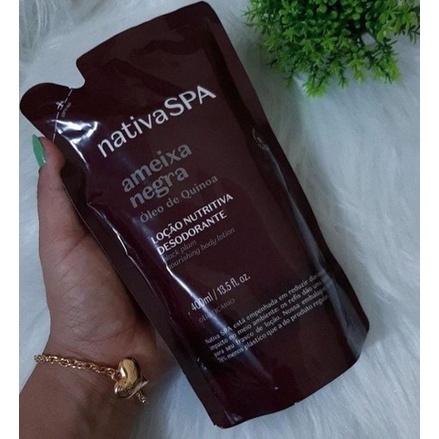 Validade 12/27 Refil Nativa SPA Loção Desodorante Hidratante Corporal Ameixa Negra, 350 ml é uma forma econômica e sustentável de repor o conteúdo da sua loção hidratante preferida. Com um delicioso aroma floriental amadeirado, ele proporciona uma hidratação profunda na pele e também desodoriza. Sua fórmula enriquecida com gotas purificadas de quinoa, que aumentam a produção de colágeno e previnem a perda da elasticidade da pele. Além de hidratar, loção corporal traz do leste da França o lado mais profundo da ameixa negra para caracterizar sua fragrância. Seu formato em microcápsulas se rompe ao longo do dia, trazendo momentos de surpresa e alta durabilidade da perfumação. 1 refil de hidratante e so recarregar seu frasco