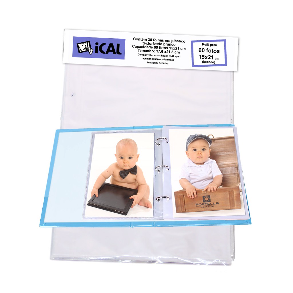 30 Refil para 60 fotos 15x21 cm (saquinhos plásticos) Refil para álbum de fotos 15x21cm (pacote com 30 unid. para 60 fotos 15x21 cm) Altura: 21,5 cm Cor Branco Peso 108 gramas Largura 17,6 cm Furação para fichário 3 furos Material folhas em plástico texturizado branco Conteúdo da Embalagem 1 (um) refil para Fotos (30 unidades para 60 fotos 15x21 cm) Dimensão da foto 15x21 cm Capacidade 2 fotos por folha Cada folha possui capacidade para 2 fotos 15x21 cm. Compatível com todas as linhas de álbuns da Ical que possuem sistema de encadernação com ferragem.
