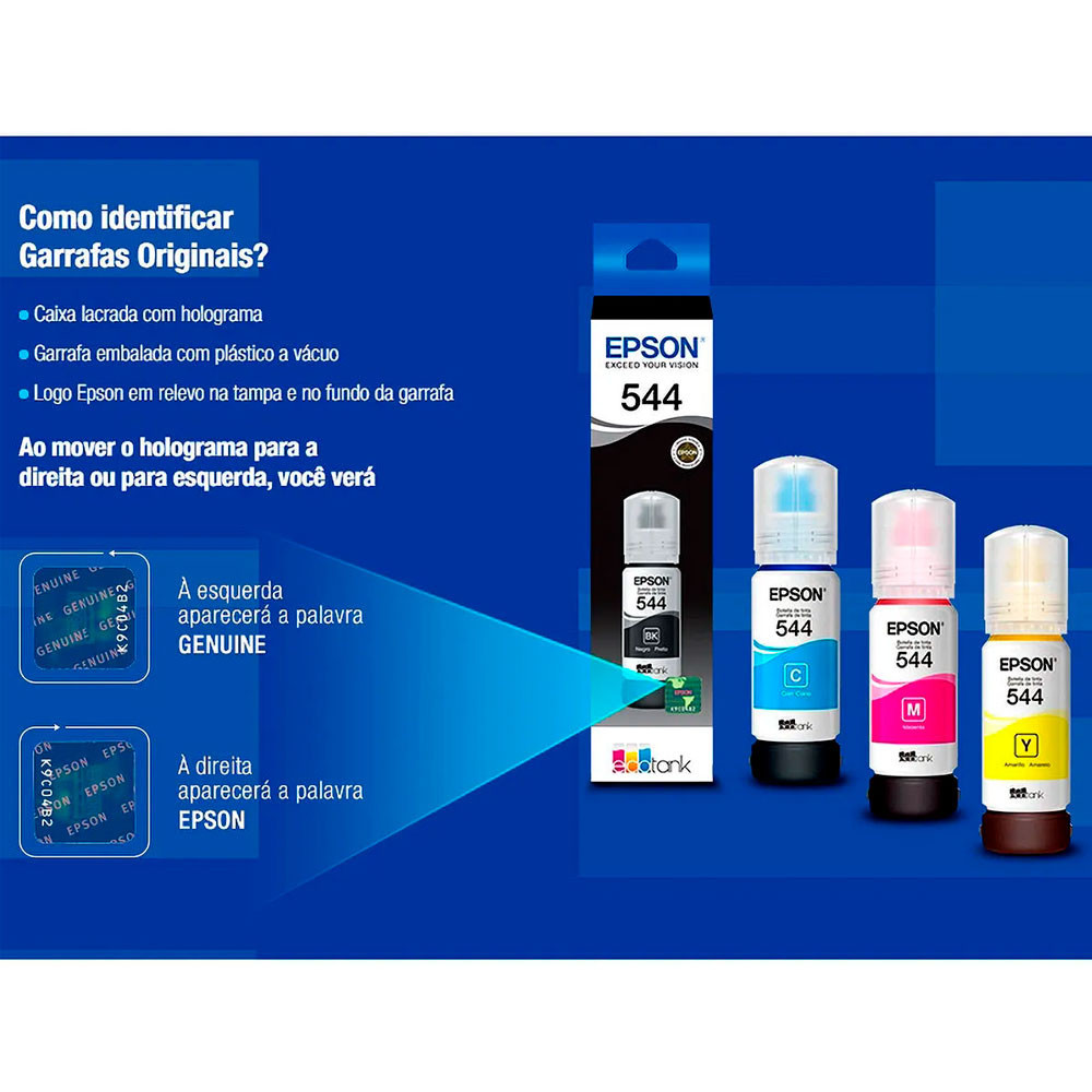 Refil De Tinta Epson 544 Ciano 65ml Para Impressoras L3110 / L3150 / L5190 - T544220 Muito mais qualidade, muito mais durabilidade As tintas Epson possuem a tecnologia MicroPiezo que proporciona alta precisão no tamanho da gota, alta resolução e definição nas impressões. Você poderá imprimir documentos e imagens com ótima qualidade por um baixo custo por página. Compatibilidade: - L3150 / L3110 / L3210 / L3250 / L5190 Especificações: - Marca: Epson - Modelo: T544220 Ciano - Conteúdo: 65ml - Rendimento: 7.500 páginas - Cor do refil: Ciano Itens Inclusos: - 1 Refil De Tinta Epson T544 Ciano 65ml Para Impressoras L3110 / L3150 / L5190 - T544220 Garantia: 3 meses