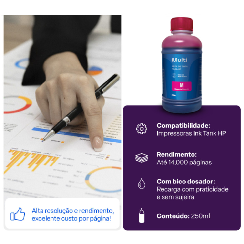 Refil de Tinta para Cartucho Magenta, para você fazer a recarga do seu cartucho. Imprima documentos e fotos em perfeita qualidade. Compatibilidade com todas as impressoras com tanque de tinta. Tenha Impressões de alta resolução e definição, rende até 14.000 páginas por refil, Magenta. Imagens Meramente Ilustrativas.