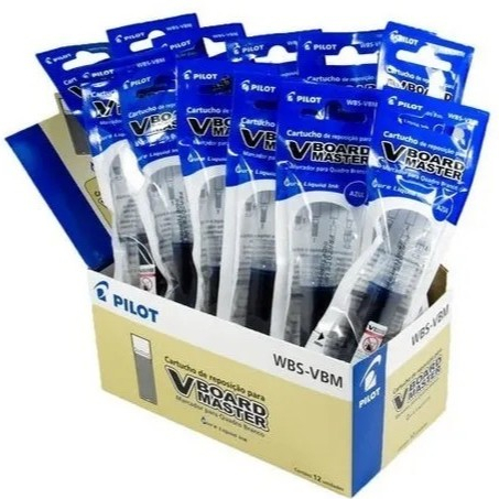 Refil de Pincel Marcador Quadro Branco Vboard Master 12 Unidades PILOT. EMBALAGEM: 12 UNIDADES Produto: - Tinta líquida. - Conteúdo 5.5 ml. - Cartucho de reposição Marcador WBMA-VBM-M. Tinta mais renomada do mundo todo, escreve mais de 600 metros lineares com apenas um refil, mais durabilidade e a confiabilidade que a Pilot nus oferece. Tudo que você precisa na sua escola, cursinho, escritório, empresa e na sua casa para se divertir e ensinar os filhos. Observação: Na compra dos refis sortidos você pode montar de acordo com sua necessidade. Basta mandar mensagem após a compra com as cores e quantidade.
