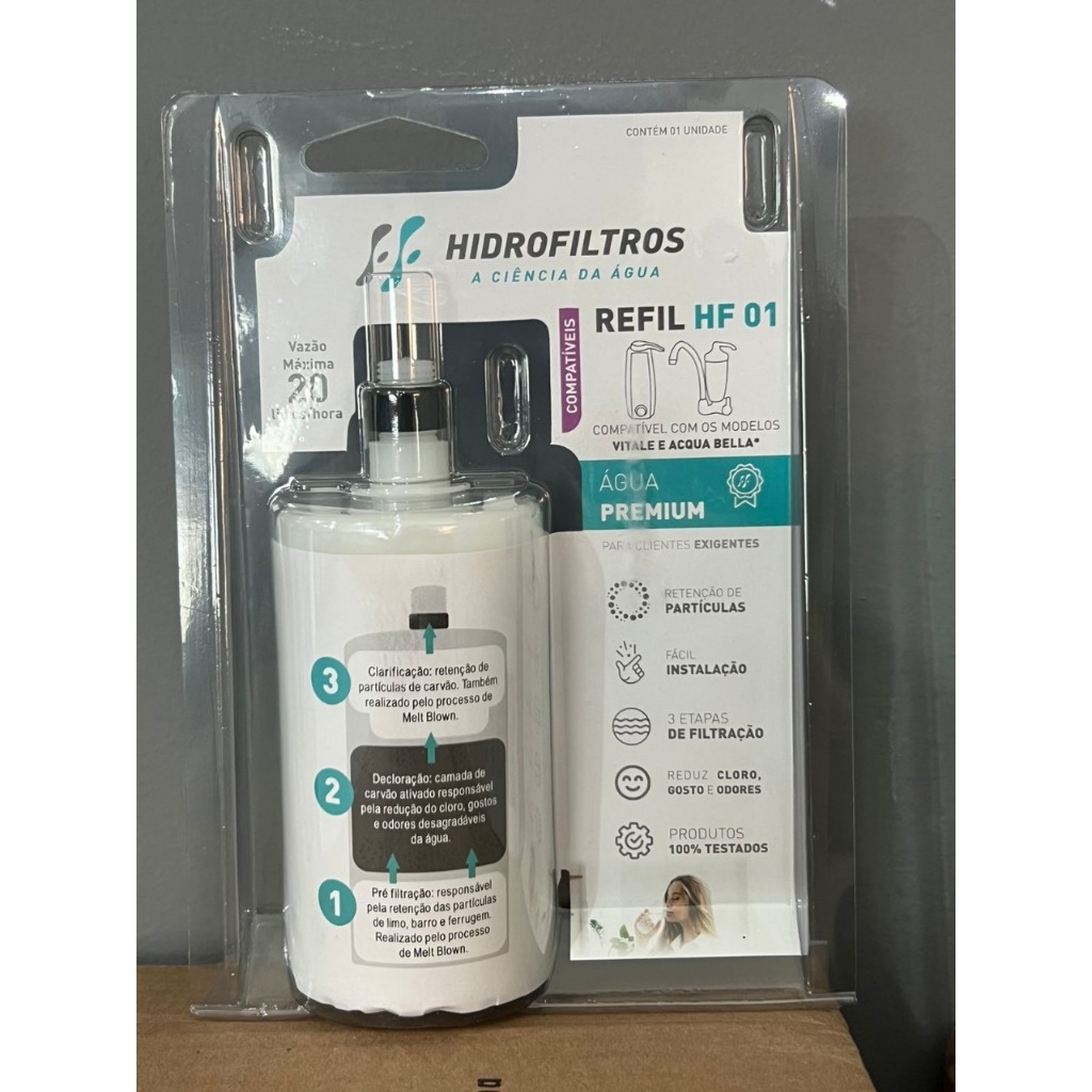 Refil Purificador de Água Para Lorenzetti Acquabella e Vitale – HF01 HIDRO FILTROS O Refil HF01 é compatível com os filtros Acquabella e Vitale da marca Lorenzetti. Com três etapas de filtração, tenha água livre de sedimentos e do cloro em excesso. Retire sujeiras e o cloro da água que você e sua família consomem. Possui três etapas de filtração. * A primeira camada de polipropileno atóxico retém a sujeira como areia, barro e limo. * Na sequência, a água encontra um leito de carvão ativado, com eficiência máxima em redução do cloro. * Por último, na etapa de clarificação, a água encontra uma nova barreira em polipropileno para -OBSERVAÇÃO :A venda é somente do refil Marca : HIDRO FILTROS Obrigado Pela Visita E Boas Compras !!!