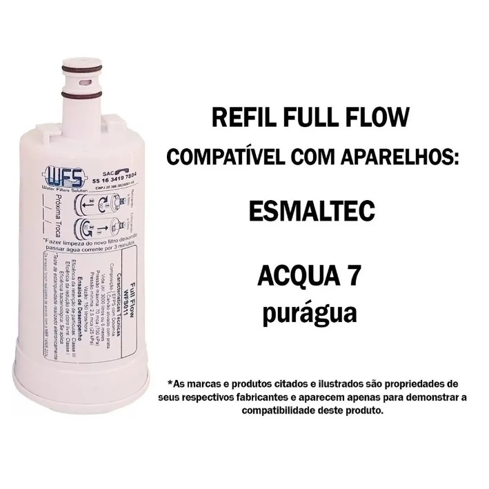 WFS 011 FULL FLOW Marca: WFS, COMPÁTIVEL COM ESMALTEC Compatível somente com os modelos: ACQUA 7 PURÁGUA Compatível para linha de Purificadores de Água ESMALTEC com água gelada e natural. REFIL 2 EM 1 ( Elemento Filtrante ) Desenvolvido para uso com água potável, ou seja, tratada por concessionária de fornecimento de água. Seu filtro "2 em 1" tem por finalidade reter impurezas nela contida, assim como, reduzir cloro, odores e sabores estranhos à água. Filtro possui em média uma vida útil de 4.000 litros, podendo ser reduzida dependendo da qualidade (impurezas, teor de cloro, etc...) da água utilizada diariamente. Caso a vazão de água diminua sensivelmente, ou se observem alterações de gosto ou odor na água, isto indica a saturação do elemento filtrante e/ou do carvão ativado, sendo necessário em qualquer dos casos a troca do filtro entre 6 e 9 meses, por questão de segurança, o seu filtro deverá ser substituído mesmo que não apresente nenhum tipo de alteração acima descrito. 1a.Etapa - Pré-Filtro: Cartucho em polipropileno atóxico produzido pelo sistema Melt blown, que consiste na sobreposição de microfibras tramadas. Retém impurezas (superiores a 5 micra) na sua superfície e ao longo de sua espessura, conferindo-lhe maior durabilidade. 2a.Etapa - Filtro: Carvão ativado que pelo processo de absorção reduz cloro, odores e sabores estranhos à água. Este carvão é impregnado com prata coloidal cuja ação bacteriostática inibe a proliferação de microorganismos em seu interior. IMPORTANTE: Use o elemento filtrante de qualidade e compatível para garantir o perfeito funcionamento e qualidade do produto. BENEFÍCIOS - Elimina odores - Elimina sabores desagradáveis - Retém partículas (barro, areia, ferrugem e sedimentos) - Reduz cloro - Bacteriostático (controla a proliferação de bactérias) - 3 etapas de filtragem - Produto a ser utilizado com água potável, de acordo com a Portaria MS 2914 - Teste de estanqueidade realizado eletrônicamente. Os ensaios foram realizados de acordo com a NBR 14908:2004 CARACTERÍSTICAS TÉCNICAS Vida útil: 3000 litros ou 6 MESES Pressão de Operação: 25 a 700 kPa Vazão: 50/60 litros/hora Ensaios de Desempenho Retenção de Partículas: Classe III Retenção da Redução de Cloro Livre: Classe I Eficiência antimicrobiana: Se aplica TROQUE A CADA 6 MESES Após esse período os microporos do filtro ficam preenchidos pelas impurezas e não realizam mais a purificação adequada.