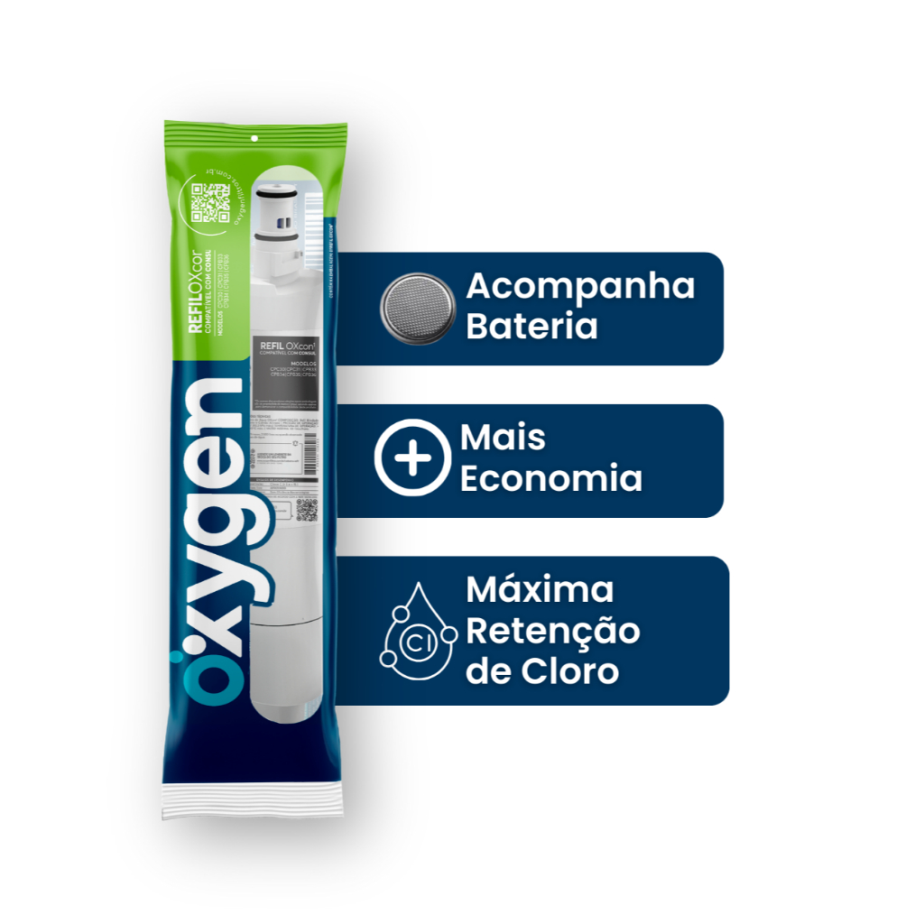 Refil Oxygen OXcon¹ é compatível com Purificadores de ÁGUA CONSUL modelos: CPC31AB | CPC31AF | CPB34AS | CPB34AF | CPB34AB | CPB35AB | CPC30AF | CPC30AB | CPB35AF | CPB36AB | CPB36AF. Com fácil instalação. A exclusiva tecnologia de filtragem dos filtros Oxygen com carvão ativado de alta qualidade garante água pura e cristalina com máxima retenção de cloro, pois seu tempo de decloração é 2 vezes maior comparado a outras marcas. Com 03 etapas de filtração os filtros Oxygen tem alta qualidade e capacidade de filtragem, sendo capaz de eliminar partículas, barro, ferrugem, areia e outros sedimentos. Os filtros Oxygen são desenvolvidos com alta tecnologia e com uso de energia renovável. Optando por este produto, você colabora com a natureza, pois a energia elétrica renovável utilizada na indústria de fabricação não gera emissão de CO². A linha de filtros Oxygen para purificadores de água é sustentável e pode ser descartado de forma correta no lixo plástico. Não necessitando de limpeza ou retrolavagem. - Água Pura por mais tempo - Garantia de filtragem por até 06 meses ou 3.500 litros - Controle de nível microbiológico - Garante que microorganismos não se proliferem dentro do refil Garantia e Validade: O elemento filtrante possui garantia somente contra defeitos de fabricação por um período de 03 meses (90 dias), podendo saturar antes do previsto para vida útil devido às condições da água onde será instalado.Este produto possui validade por tempo indeterminado até sua instalação desde que conservado em sua embalagem original, protegido do calor, umidade, poeira e contaminação.