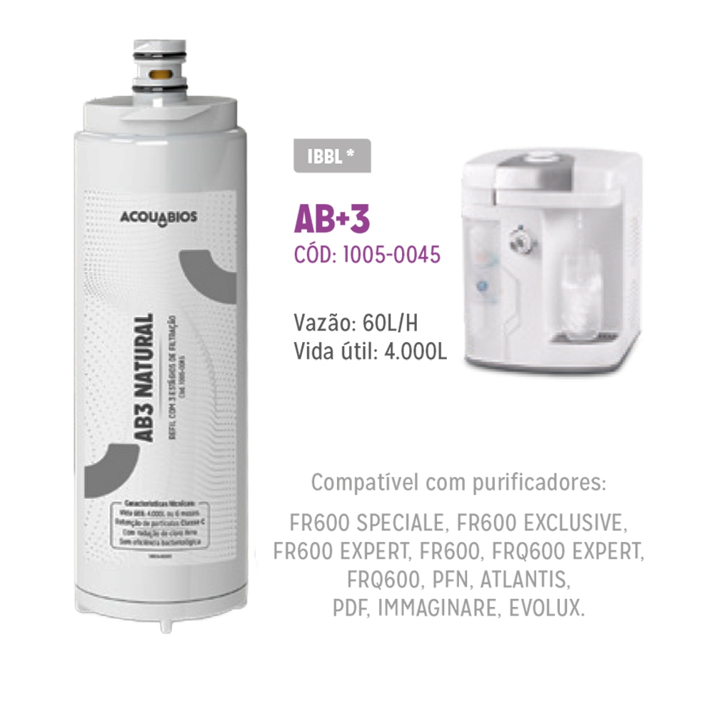 Refil Ibbl Compatível Fr600 Speciale Immaginare Expert AB+3 Carvão Ativado Compatível com os Modelos: Immaginare, FR600 Speciale, FR600 Expert, FR600, FRQ600 Expert, FRQ600, PFN, Atlantis, PDF. O Refil Girou Trocou C+3 possui o Sistema de tripla filtragem, que retém as impurezas da água como barro, ferrugem e sedimentos. Reduz o cloro e elimina sabores e odores indesejáveis. Prático sistema refil GIROU TROCOU garante ao usuário uma fácil substituição do refil e manutenção do equipamento. O elemento filtrante possui alto poder de remoção do cloro livre, sabores e odores indesejáveis, elevando a qualidade da água. Este elemento possui tripla filtração. A primeira camada de polipropileno atóxico retém a sujeira como areia, barro e limo através do processo de Melt Blown. Em seguida, a água encontra um leito de carvão ativado granulado, com eficiência máxima em redução do cloro, através da tecnologia HPC. Por último, na etapa de clarificação, a água encontra uma nova barreira em polipropileno para evitar a passagem de pequenos resíduos de carvão, oriundos da etapa anterior. Vida útil: 4.000 L ou até 6 meses. 3 Etapas de Filtragem Eficiência de Retenção de Partículas Elimina odores Elimina sabores Bacteriostático: controla a proliferação de bactérias Envio Rápido!