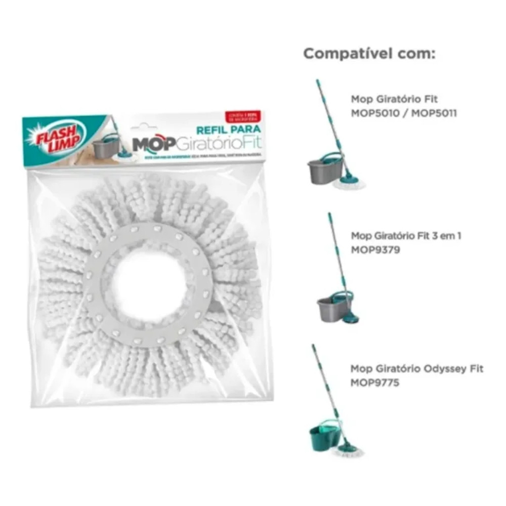 Refil para Mop Giratório Fit Flash Limp O Refil para Mop Giratório Fit é lavável e 100% microfibra. Não acompanha cabo e base. Compatível com os mops: - MOP5010 (Mop Giratório Fit) - MOP9775 (Mop Giratório Odyssey Fit) - MOP9379 (Mop Giratório Fit 3 em 1) - MOP7504 (Mop Giratório Duas Águas Fit) Ideal para tirar pó e para limpezas secas e úmidas. DIÂMETRO DO ENCAIXE: 13,5 CM Obs.: Compatível apenas com o modelo MOP GIRATÓRIO FIT da marca Flash Limp. Referência do Produto.: RMOP5011
