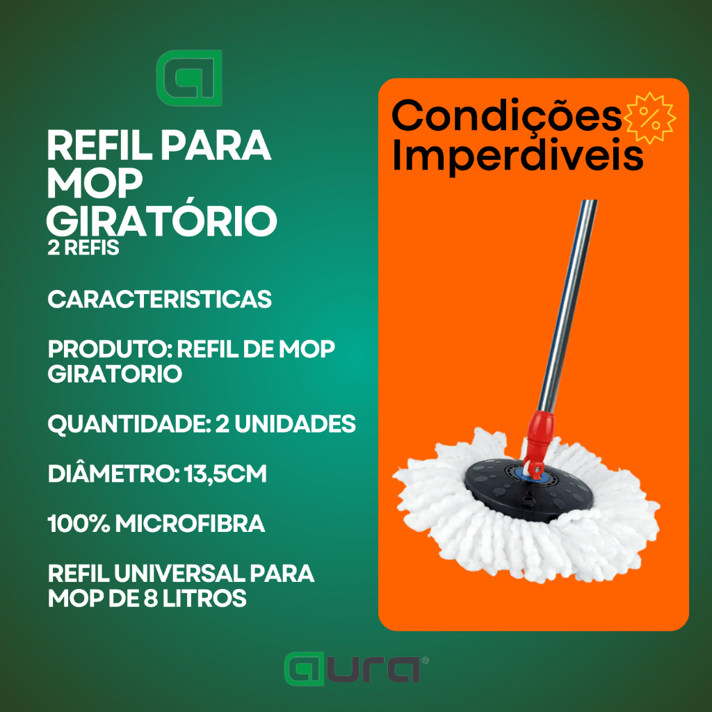 Chegou o novo Refil Mop Giratório, o aliado perfeito para tornar sua rotina de limpeza muito mais eficiente e prática. Combinando qualidade e utilidade, esse refil é tudo o que você precisa para manter seus pisos brilhando! Seu design exclusivo permite uma fácil colocação e remoção do refil, facilitando ainda mais a sua rotina de limpeza. Aproveite essa oportunidade única e adquira agora o kit com 2 unidades do Refil Mop Giratório. Com esse kit, você terá refis de sobra para manter sua casa sempre limpa e higienizada. Não perca essa chance de garantir qualidade, praticidade e economia em um só produto. Este Anuncio Contém: Produto: Refil de Mop Giratorio Quantidade: 2 unidades Diâmetro: 16,5cm 100% Microfibra