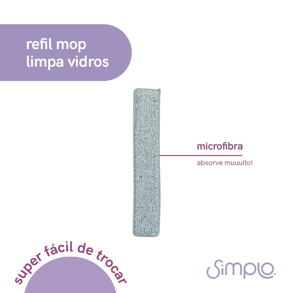"conheça o refil do mop limpa vidros da simplo! o refil é 100% de microfibra e possui alta absorção. a microfibra tem tecnologia eletroestática: atrai e retém poeira! é ideal para vidros, azulejos, janelas e outras superfícies lisas. é simplo. leve praticidade e modernidade para sua casa! medidas: comprimento: 27,5cm | largura: 5cm | altura: 0,8cm"