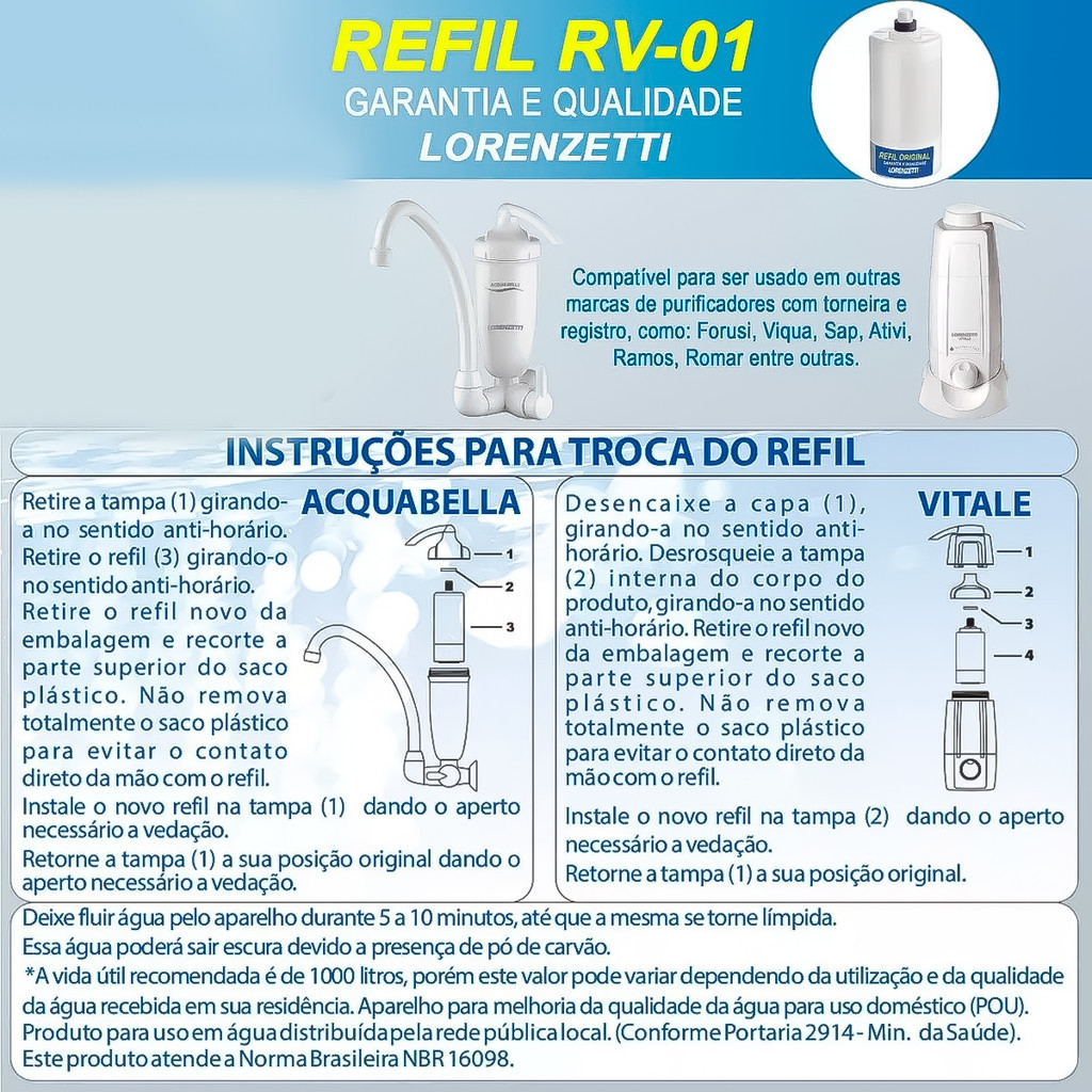 Refil Para Purificador Filtro Acqua Bella E Vitale RV - 01 Original Lorenzetti Novo Água + Pura