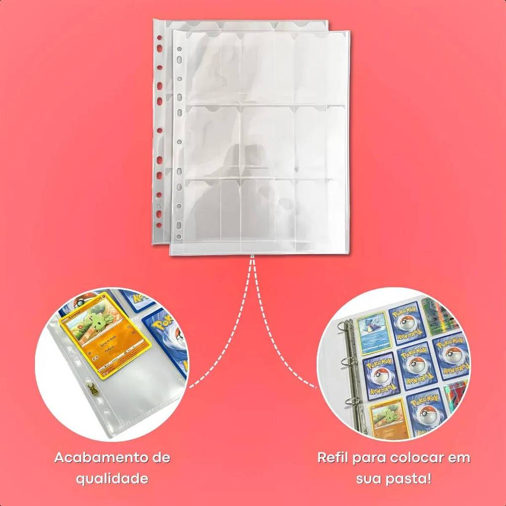 Armazene e proteja sua coleção com praticidade e segurança. Este kit da DAC contém 10 folhas plásticas com 9 bolsos cada, permitindo a organização de até 180 cards (usando frente e verso). Ideal para colecionadores, crianças ou entusiastas, garante proteção para seus cards mais valiosos, sejam eles originais ou personalizados. Detalhes: - Quantidade: 10 folhas plásticas (refis) - Capacidade total: Até 180 cards (frente e verso) - Tamanho da folha: A4 (22,5 x 28,7 cm) - Tamanho das divisões: 7 x 9,3cm - Furação universal: Compatível com pastas de 2, 3 e 4 argolas - Material: Polipropileno de alta transparência e resistência - Banda lateral reforçada: Maior durabilidade no uso diário - Bolsos transparentes: Visualização dos cards frente e verso