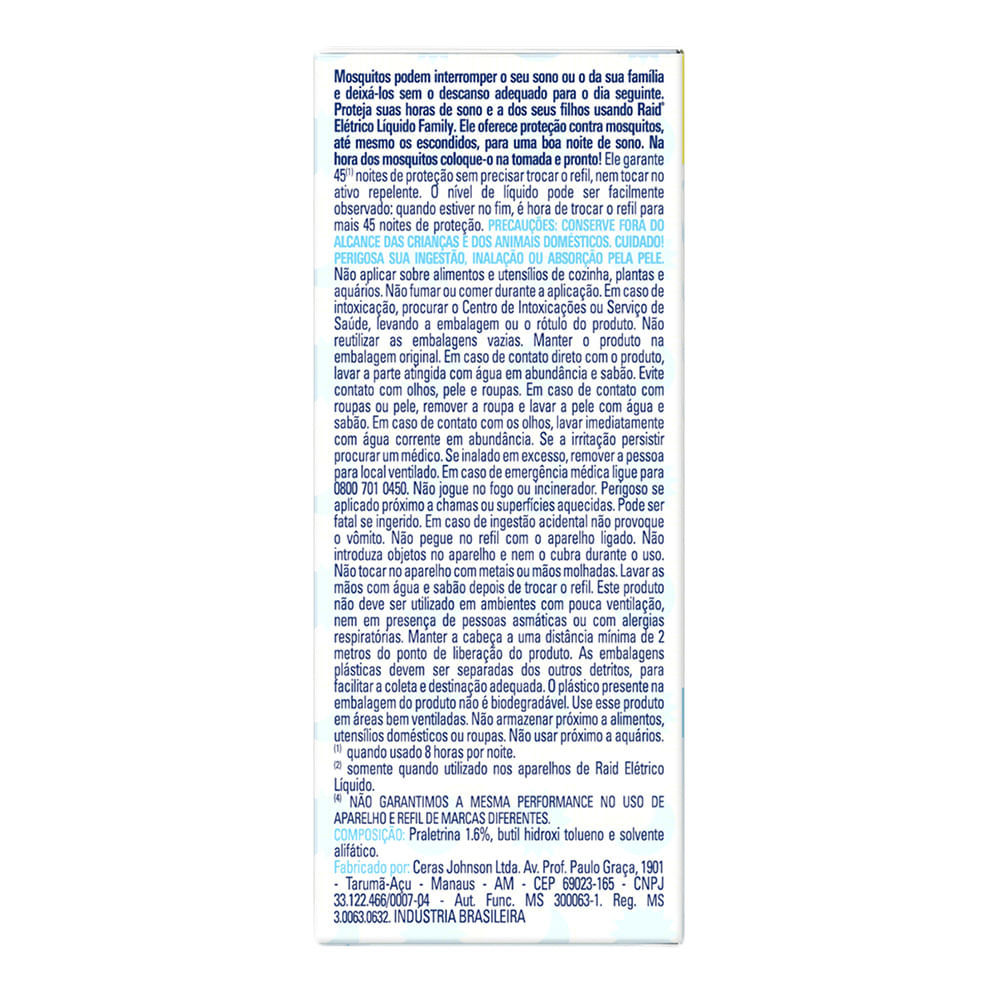 REFIL RAID FAMILY 45 NOITES REPELENTE LÍQUIDO COM 50% DE DESCONTO NA SEGUNDA UNIDADE Raid elétrico líquido Family repele mosquitos e pernilongos, oferecendo proteção para toda a família, inclusive par