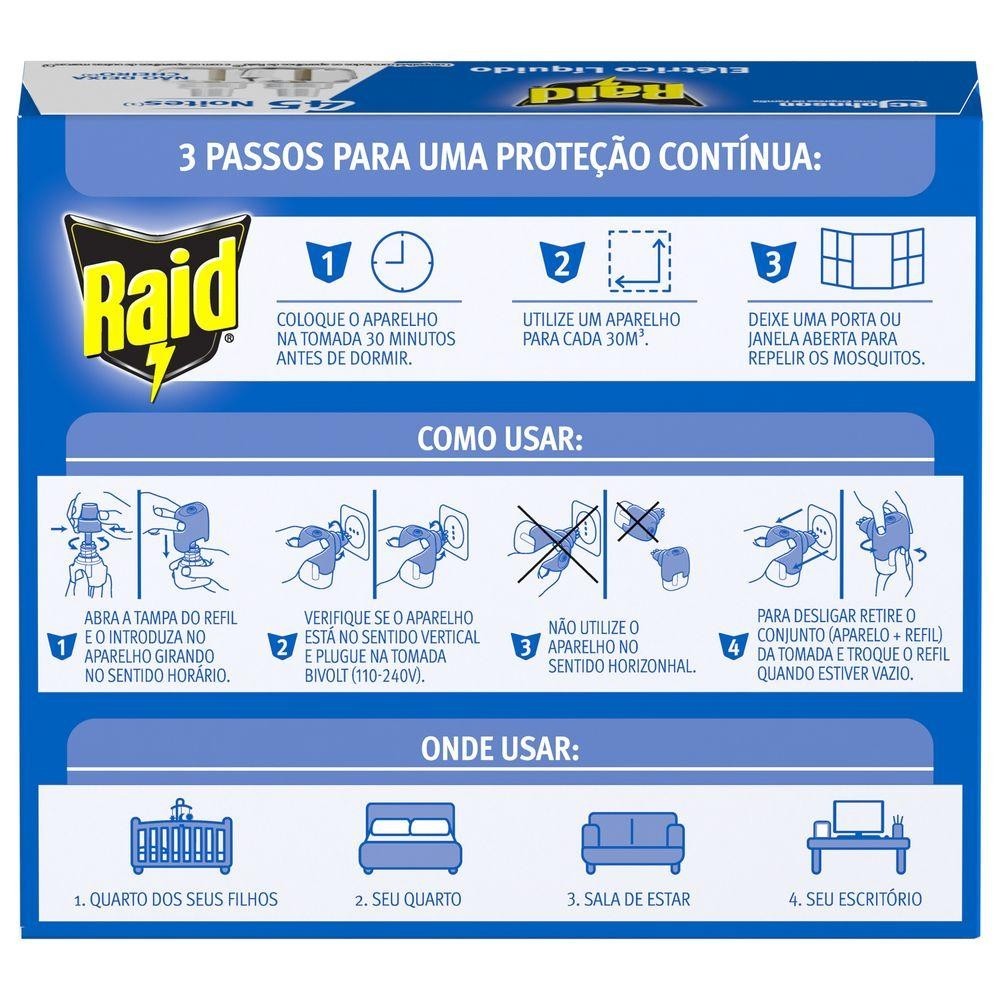 Raid Elétrico Líquido oferece proteção contra os mosquitos por até 45 noites. Disponível nas versões regular, eucalipto e citronela. Utilize sempre um aparelho para cada 10m quadrados. Dica: coloque o aparelho na tomada 30 minutos antes de dormir e deixe sempre uma porta ou janela aberta para repelir os mosquitos do ambiente. 1. Abra a tampa do refil e o introduza no aparelho girando no sentido horário. 2. Plugue o aparelho na tomada bivolt (110-240V), sempre no sentido vertical. 3. Para desligar, retire o conjunto (aparelho + refil) da tomada e troque o refil quando estiver vazio.
