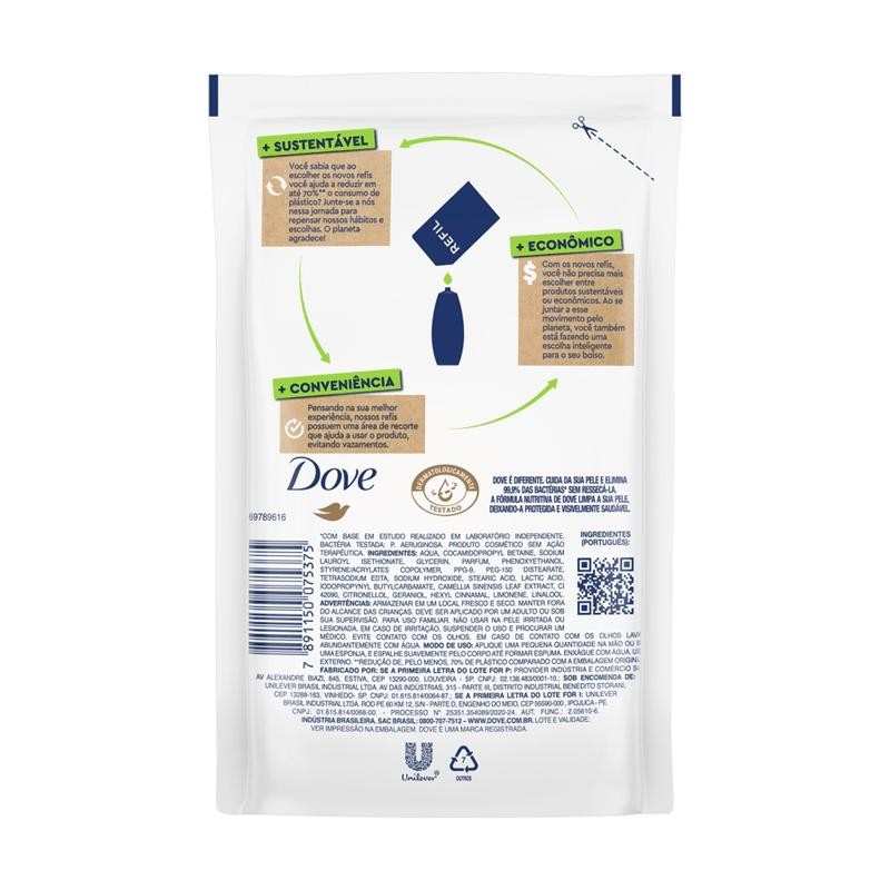 • O Sabonete Líquido Dove Cuida & Protege Antibacteriano elimina 99,9% * de bactérias. • O Sabonete Líquido Dove Cuida & Protege Antibacteriano mantém sua pele nutrida e protegida. • Enriquecido com nosso creme hidratante exclusivo para limpeza suave. • O Sabonete Antibacteriano Dove Cuida & Protege foi formulado com propriedades antibacterianas para manter sua pele protegida. • O Sabonete Líquido Dove Cuida & Protege Antibacteriano Refil é adequado para uso diário para corpo, rosto e mãos. • Fórmula nutritiva deixa você com uma pele macia, suave e protegida. Agora Dove elimina 99,9% das bactérias* Todos nós queremos dar à nossa pele os cuidados necessários para se mantê-la limpa, saudável, nutrida e protegida. Se você está procurando uma maneira de dar um toque extra de amor e cuidado para à sua pele, o sabonete líquido Antibacteriano Dove Cuida e Proteger Refil é perfeito para você. Sua fórmula nutritiva combina a limpeza da pele com os cuidados clássicos de Dove. Seu novo formato refil é perfeito para utilização em garrafas ou pumps, ideal para o banho ou lavagem das mãos. A fórmula suave da barra de beleza de Dove, tem propriedades capazes de eliminarem até 99,9% das bactérias e é enriquecida com exclusivo creme hidratante. Sua fórmula combina a proteção com a hidratação que só Dove proporciona para pele incrível. Dove Cuida e Protege proporciona uma limpeza suave, perfeita para uso diário, sem agredir a sua pele. Você pode utilizar o sabonete líquido refil de Dove para o rosto, corpo e mãos. Sua fórmula nutritiva com PH neutro hidrata enquanto limpa, para que você não precise se preocupar com o ressecamento da pele enquanto cuida de você. Dove cuida e protege você para que você possa apreciar a pele macia e suave que você merece. Para uma melhor experiência, sugerimos que molhe a região da pele a ser limpa e aplique cerca de uma gota de sabonete hidratant antibacteriano Dove. Espalhe com movimentos circulares e enxágue. Banho com esponja: aplique uma pequena quantidade de produto na esponja e passe suavemente pelo corpo, *Base em um estudo em laboratório independente. Bactéria testada: P. Aeruginosa