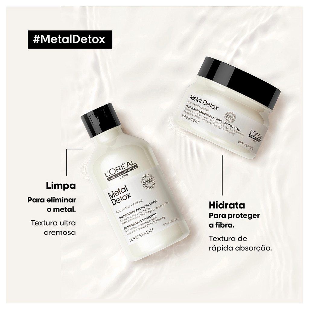 Refil Shampoo Expert Metal Detox 500ml - L'oréal Professionnel Você está comprando em uma loja Autorizada L'oréal Professionnel. Sobre o produto: Shampoo de Limpeza Anti-Depósito de Metal da gama Metal Detox desintoxica o cabelo após qualquer serviço de coloração, balayage ou descoloração.O metal dentro da fibra provoca risco de quebra e impacta negativamente os resultados de cor durante o serviços de coloração, balayage e descoloração.A sua textura cremosa e rica transforma-se numa espuma suave que gentilmente lava o cabelo e remove a acumulação de partículas de metal. Glicoamina: Uma tecnologia patenteada, concentrada em glicoamina, a molécula que rastreia e neutraliza o metal no interior da fibra. Resultado:-O cabelo é desintoxicado, para uma cor e brilho mais intenso.-Fórmula sem sulfatos e segura para a cor. Cor mais duradoura, 2x mais brilhante.-O cabelo fica mais forte.-A fibra é reforçada, e fica mais resistente à quebra.-A cor dura mais tempo, 2x mais brilhante. 97% menos quebra.-O cabelo fica mais suave, nutrido durante 72 horas.-Cor 100% fiável. Modo de usar: Com o cabelo úmido, aplique o shampoo massageando até fazer espuma. Enxágue. Repita o procedimento quando achar que for necessário. Resultado Cabelo saudável, hidratado, nutrido e com brilho intenso.