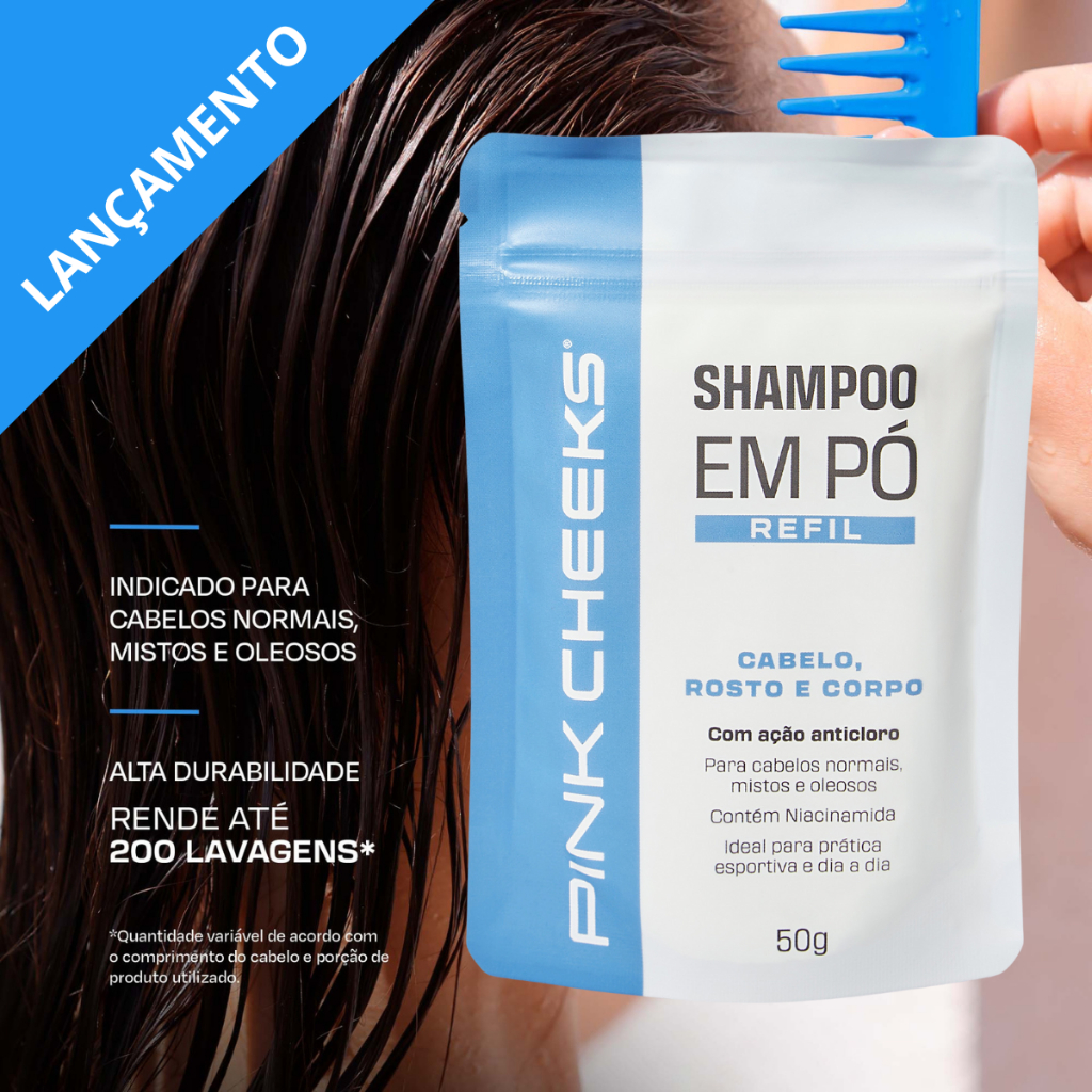 O suor e a oleosidade dos treinos, o ressecamento e o cloro das piscinas afetam diretamente a saúde dos seus fios — e seu cabelo sente cada um desses impactos. Mas isso muda com o SHAMPOO EM PÓ da PINK CHEEKS, que entrega resultados visíveis desde a primeira aplicação. Com uma pequena quantidade de água, se transforma em uma espuma cremosa. Sua potente fórmula diminui a oleosidade, protege contra o cloro, fontes de calor e procedimentos químicos. Mais do que limpar, fortalece e age como tônico para os fios mais frágeis. E tem mais: com tecnologia waterless, é compacto e fácil de carregar, seja na nécessaire de treino ou na mala de viagem. Além disso, possui alta durabilidade e é refilável, trazendo ainda mais sustentabilidade e performance. • Pode ser usado no cabelo, rosto e corpo • Proporciona limpeza e remove a oleosidade • Protege os fios da agressão do cloro • Auxilia no fortalecimento dos fios fragilizados e estimula o crescimento, agindo como tônico. • Alta durabilidade com rendimento de até 200 lavagens* • Potencializado com Niacinamida • Indicado para cabelos normais, mistos e oleosos • Indicado para uso no esporte ou no dia a dia • Ideal para a prática de esportes aquáticos *Quantidade variável de acordo com o comprimento do cabelo e porção de produto utilizado. COMPOSIÇÃO EM PORTUGUÊS COCO SULFATO DE SÓDIO; COCOIL ISETIONATO DE SÓDIO; AMIDO; NIACINAMIDA; AMIDOGLICOLATO DE SÓDIO; SILICA; ESTEARATO DE MAGNÉSIO; ÁCIDO CÍTRICO; CLORETO DE HIDROXIPROPILTRIMONIO GUAR; BENZOATO DE SÓDIO; GOMA XANTANA; PERFUME; TIOSSULFATO DE SÓDIO PENTAIDRATADO; BENZOATO DE BENZILA; LINALOL; BUTILFENIL METILPROPIONAL; DEXTROLIMONENO; ALFA ISOMETIL IONONA. Fazendo a troca do seu refil. Retire a tampa do frasco original do SHAMPOO EM PÓ; Apoie o refil em uma base plana e corte no local indicado; Posicione a embalagem do refil na abertura do frasco original e despeje com cuidado; Recoloque a tampa do frasco original. Usando o SHAMPOO EM PÓ. Molhe os cabelos e coloque uma pequena quantidade de SHAMPOO EM PÓ na palma das mãos. Em seguida, adicione algumas gotas de água e misture, até que se forme uma espuma cremosa. Depois, aplique o produto dissolvido no couro cabeludo, massageando com as pontas dos dedos, fazendo movimentos leves e circulares. Para finalizar, enxágue até que todo o produto seja removido. Caso necessário, repita todo o processo. [RENDIMENTO] Para cabelos curtos, o shampoo rende até 200 lavagens. Para fios longos, o rendimento é de até 100 lavagens, aproximadamente. Manter fora do alcance de crianças. Em caso de irritação, suspender o uso e procurar orientação médica. Em caso de contato direto com os olhos, enxágue com água em abundância. USO EXTERNO.