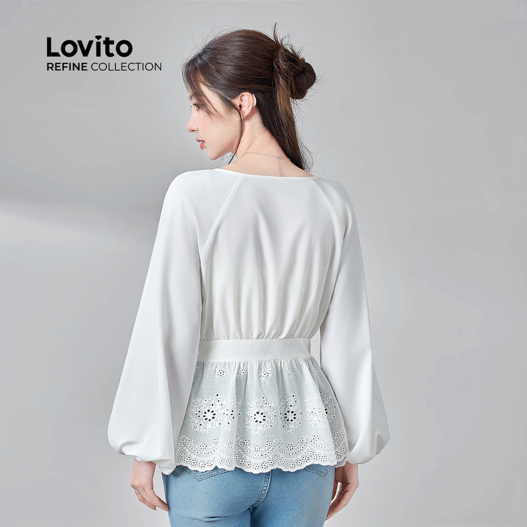 (Refine by Lovito) Blusa Casual Amarração Laço Textura Outono/inverno Blusa Branca para Mulheres. LR29A062
