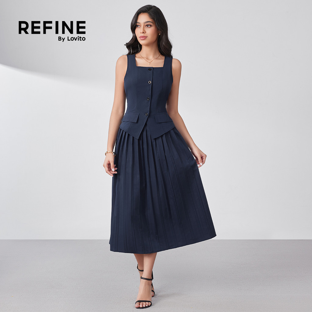 (Refine by Lovito) Elegantes Plissados com e Bolso Falso Saia Azul Marinho Primavera/verão para Mulheres LR32L021
