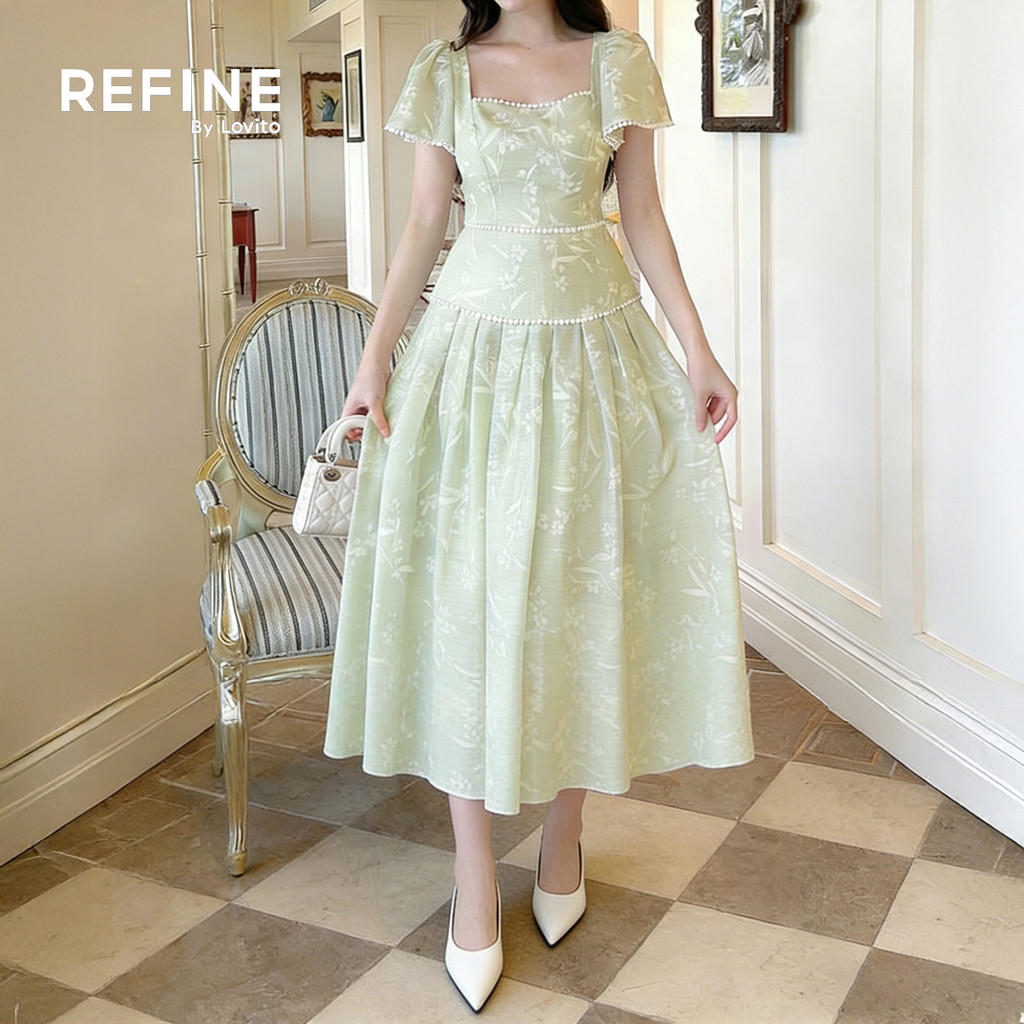 (Refine by Lovito) Vestido Elegante Babados No Pescoço e Pregas Vestido Verde de Primavera/verão para mulheres LR35L411
