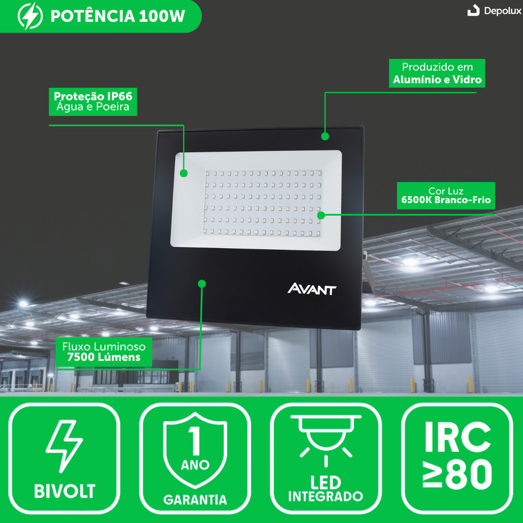 REFLETOR LED 100W HOLOFOTE IP 66 PROVA D'ÁGUA AVANT O Refletor LED 100w à prova d'água da AVANT é perfeito para iluminação de fachadas, piscinas, jardins, árvores, eventos, festas, campos e quadras de esporte, salas comerciais e os mais diversos locais com qualidade, economia e proteção contra chuva e intempéries do tempo (IP65) .Iluminação com altíssima economia de energia, montado em caixa de alumínio blindada com vidro temperado, proporcionando longa eficiência e durabilidade. SUGESTÕES DE USO: Iluminação externa para fachadas, acesso de entrada e saída de edifícios, garagens, estacionamentos, área de jardim e lazer. CARACTERÍSTICAS: - Marca: Avant - Modelo: Slim100 - Potência: 100w - Voltagem: 127V / 220V (Bivolt) - Temperatura da cor: Branco frio (6500k) - Lúmens: 7500 Lm - Carcaça: Alumínio e Vidro - Vida útil estimada de até 25.000 horas - Angulo de abertura: 120° - Proteção: IP66 - Dimensões: 12,2 X 16,4 X 2,4. Iluminação com altíssima economia de energia, montado em caixa de alumínio blindada com vidro temperado, proporcionando longa eficiência e durabilidade. ITENS INCLUSOS: - 01 Refletor Led 100W 6500K Avant INSTRUÇÕES DE USO: 1. Desembale o refletor com cuidado. 2. Escolha o local de instalação, garantindo que seja uma superfície estável e segura. 3. Fixe o refletor utilizando os parafusos de montagem (não inclusos). 4. Conecte o refletor à rede elétrica, certificando-se de que a voltagem é compatível (bivolt 110/220V). 5. Ligue o refletor e ajuste o ângulo de iluminação conforme necessário. GARANTIA: Garantia de 12 meses contra defeitos de fabricação. Aproveite a oportunidade e garanta já o seu Refletor LED Avant 100W para uma iluminação eficiente e de alta qualidade!