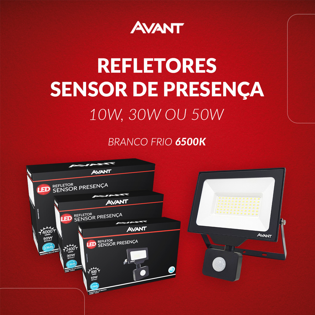 Refletor Led Com Sensor 10w 30w ou 50w 6500k 110v/220v Bivolt Ip66 Avant Ideal para iluminação externa ou interna de ambientes residenciais, comerciais ou corporativos, o Refletor com Sensor de Presença 10W oferece praticidade e economia de energia. Propriedades: Potência: 10W, 30W ou 50W Temperatura de cor: 6500K (Branco frio) Material: Alumínio e Vidro Cor: Preto Tipo de Instalação: Sobrepor Baixo consumo de energia Características de funcionamento: Temperatura ambiente: -10°C a 45°C Tensão de entrada: 100V a 240V Fator de Potência: =0,90 Ângulo de detecção: 120° Ajuste de sensor na luz ambiente: Sim Ajuste de distância do sensor de presença: 2m a 10m Ajuste de tempo: De 6 segundos a 5 minutos ligado. Especificações Técnicas e Comerciais: Fluxo Luminoso: 800 lumens Eficiência Luminosa: 80 lm/W Dimensões: 102 x 150,5mm Peso: 205g Garantia: 12 meses Sobre a Avant: A Avant é uma marca que busca oferecer soluções inovadoras e de alta qualidade para iluminação. Com foco em produtos robustos, eficientes e com tecnologia de ponta, a Avant garante a melhor experiência em iluminação, com foco em durabilidade, performance e economia de energia.