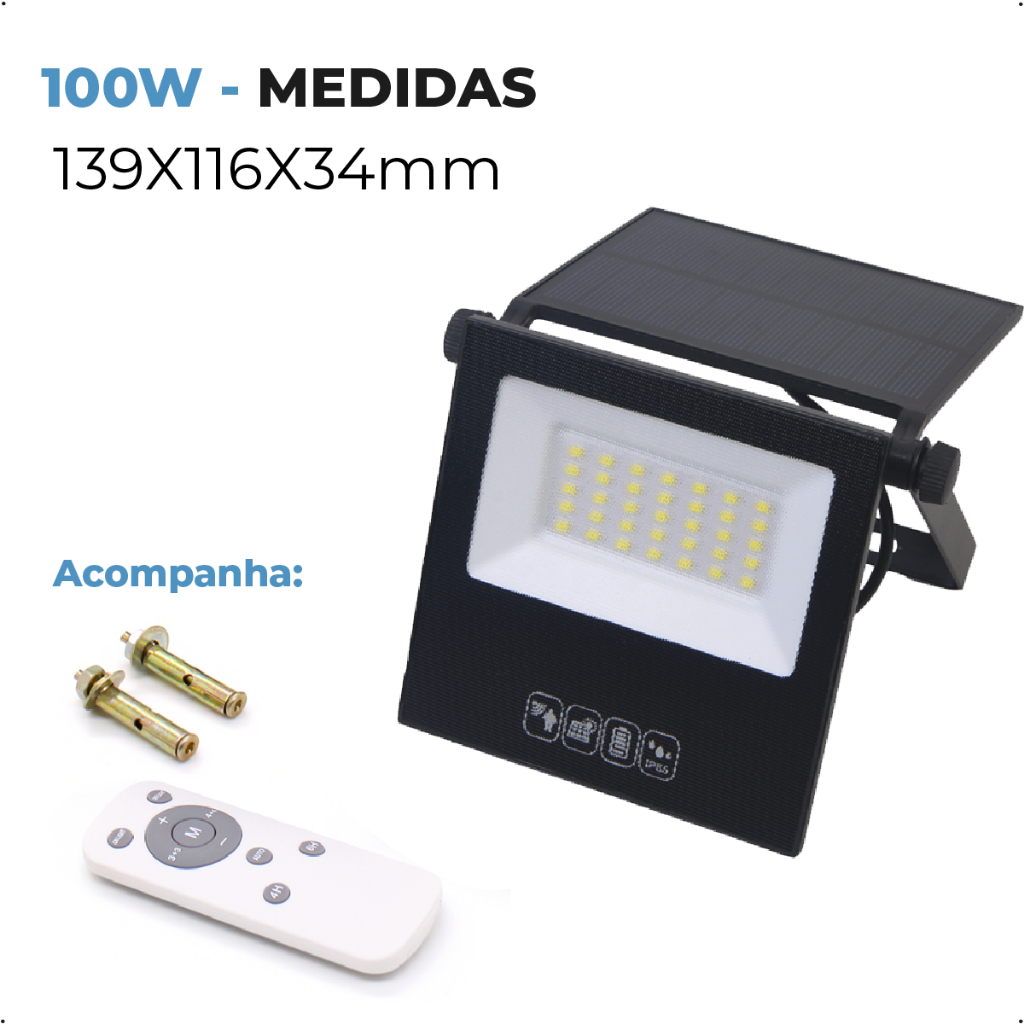 Refletor Solar Led 100w Placa Solar Luz Fria Prova Dágua Ajustável Dobrável c/ Controle Remoto