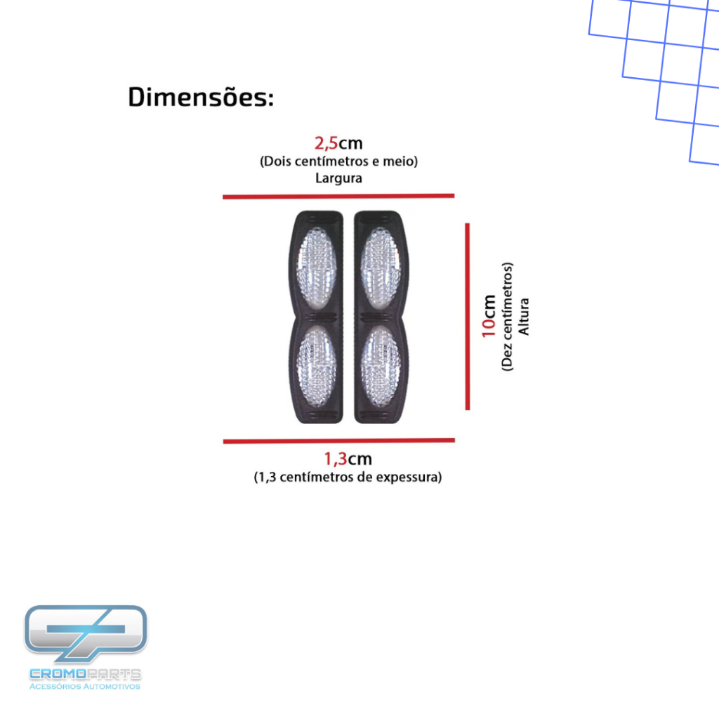 Visando melhor a experiência de compra do cliente, todas as informações contidas no anúncio tais como, descrição e título são de efeito facilitador para busca do acessório esportivo de cada veículo. O produto é destinado ao mercado automotivo secundário. Par Luminoso Oval Refletor Duplo Cristal Base Preta para Porta Lateral Linha Leve e Pesada Carros e Caminhões - Olho de Gato Universal Conteúdo da embalagem: - 02 Luminosos ovais cristal base preta. Dimensões: - Altura: 10,0 centímetros; - Largura: 2,5 centímetros; - Espessura: 1,3 centímetros. Especificação técnica: - 1ª Função: Ele brilha quando recebe raios de luz noturna - 2ª Função: Proteger a porta contra pequenas batidas de porta com porta nos estacionamento, como predios shopping, supermercados entre outros. - Maior visibilidade e durabilidade; - Base dupla preta com refletor cristal; - Fixação com fita dupla face já anexada ao produto; - A base do luminoso e fabricado em plástico resistente, com refletivo que serve para proteção da porta. Compatibilidade: - Carros todos os modelos; - Caminhões todos os modelos. Dica: Dê um novo visual para Seu veículo, os produtos da marca Shekparts são um diferencial e de fácil instalação. Importante: - Garantia de 3 meses; - Imagens meramente ilustrativas; - Valor anunciado referente ao Par; - O produto é destinado ao mercado automotivo secundário; - Para melhor fixação do produto, aplique sobre a superfície limpa e seca, não a molhando por 24 horas; - A foto (imagem) do acessório automotivo (produto) é real, porém as demais fotos (imagens) de apoio contidas no anúncio são meramente ilustrativas. Código de referência: 05.013