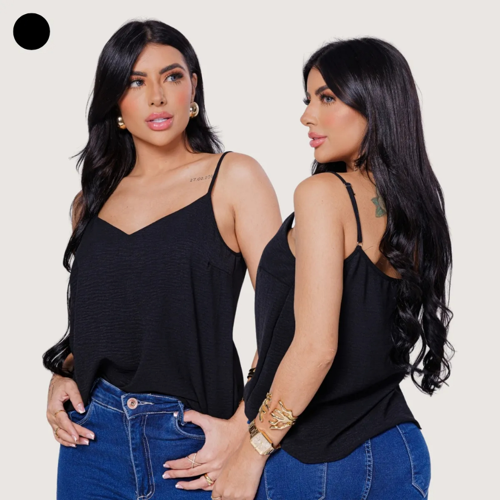 - Tecido: Duna (leve, com toque suave e macio, caimento fluido e respirável) - Decote: V - Alças Finas Reguláveis - Caimento: Solto ao corpo - Estilo: Básico, elegante e fácil de combinar - Sem bojo - Não amassa Tamanhos M, G e GG M Comprimento: 55 cm Busto: 92 ~ 94 cm G Comprimento: 57 cm Busto: 96 ~ 98 cm GG Comprimento: 59 c m Busto: 102 ~ 104 cm Caso tenha dúvidas sobre especificações do produto, tamanhos ou composição, estamos disponíveis no chat para auxiliá-lo (a).
