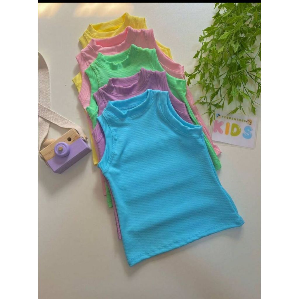 Tipo: Regata básica (camiseta sem mangas). Público-alvo: Infantil (tamanhos disponíveis do 2 ao 16). Material: Confeccionada em tecido ribana premium. A ribana é um tipo de malha canelada, conhecida por sua elasticidade, conforto e bom caimento. Características: A peça é versátil, ideal para o dia a dia e fácil de combinar, oferecendo conforto e frescor.