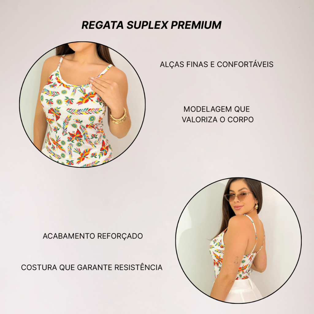 📐 COMPOSIÇÃO DO TECIDO Suplex Premium Composição: 90% Poliéster | 10% Elastano Tecido encorpado, macio e com excelente elasticidade Não amassa, não desbota e não fica transparente 📏 TABELA DE MEDIDAS (medidas aproximadas – pode variar até 2 cm) P Busto: 86 a 90 cm Comprimento: 58 cm Veste: 34 / 36 M Busto: 91 a 96 cm Comprimento: 60 cm Veste: 38 / 40 G Busto: 97 a 102 cm Comprimento: 62 cm Veste: 42 / 44 GG Busto: 103 a 108 cm Comprimento: 64 cm Veste: 46 📌 Dica inteligente: compare as medidas com uma peça sua para acertar no tamanho. ✨ BLUSINHA DE ALCINHA REGATA FEMININA EM SUPLEX Nossa regata feminina de alcinha fina é perfeita para quem busca conforto, leveza e estilo no dia a dia. Produzida em suplex premium, garante ótimo caimento e liberdade total de movimento. ✔ PRINCIPAIS CARACTERÍSTICAS Modelagem básica que valoriza o corpo Alcinhas finas, delicadas e confortáveis Tecido fresco, ideal para dias quentes Estampa moderna e durável Acabamento reforçado e costura de qualidade 👗 INDICADA PARA: Dia a dia Looks casuais Trabalho Passeios Verão e meia-estação ❓ DÚVIDAS FREQUENTES Marca o corpo? Não. O suplex tem elasticidade equilibrada e ótimo ajuste. Fica transparente? Não. Tecido encorpado e seguro. É confortável para usar o dia todo? Sim! Leve, respirável e não incomoda.