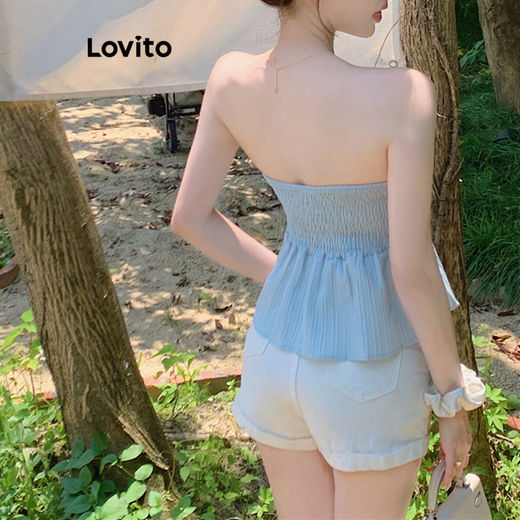 Regata Casual Feminina Lovito Lisa Plissada com Babados e Bainha em Branco, Azul e Preto - LNE35069
