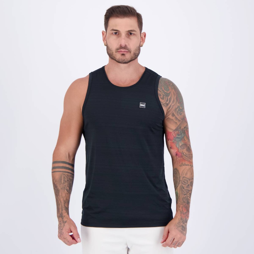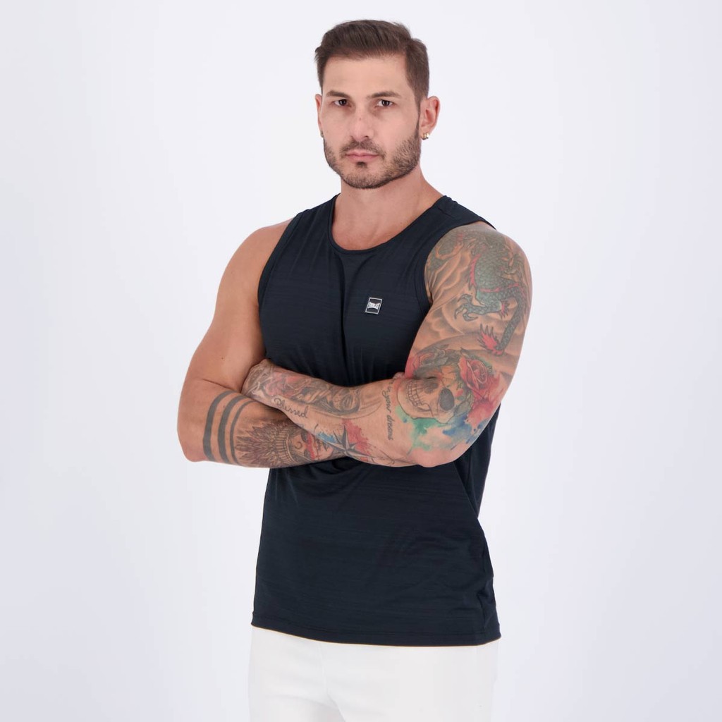 Composição: 93% Poliéster e 07% Elastano Cor predominante: Preta Indicado para: Treino Gênero: Masculino Origem: Nacional Logo: Emborrachada Manga: Regata Gola: Careca Dimensões aproximadas (A x L): P: 70 x 51 cm M: 72 x 53 cm G: 74 x 55 cm