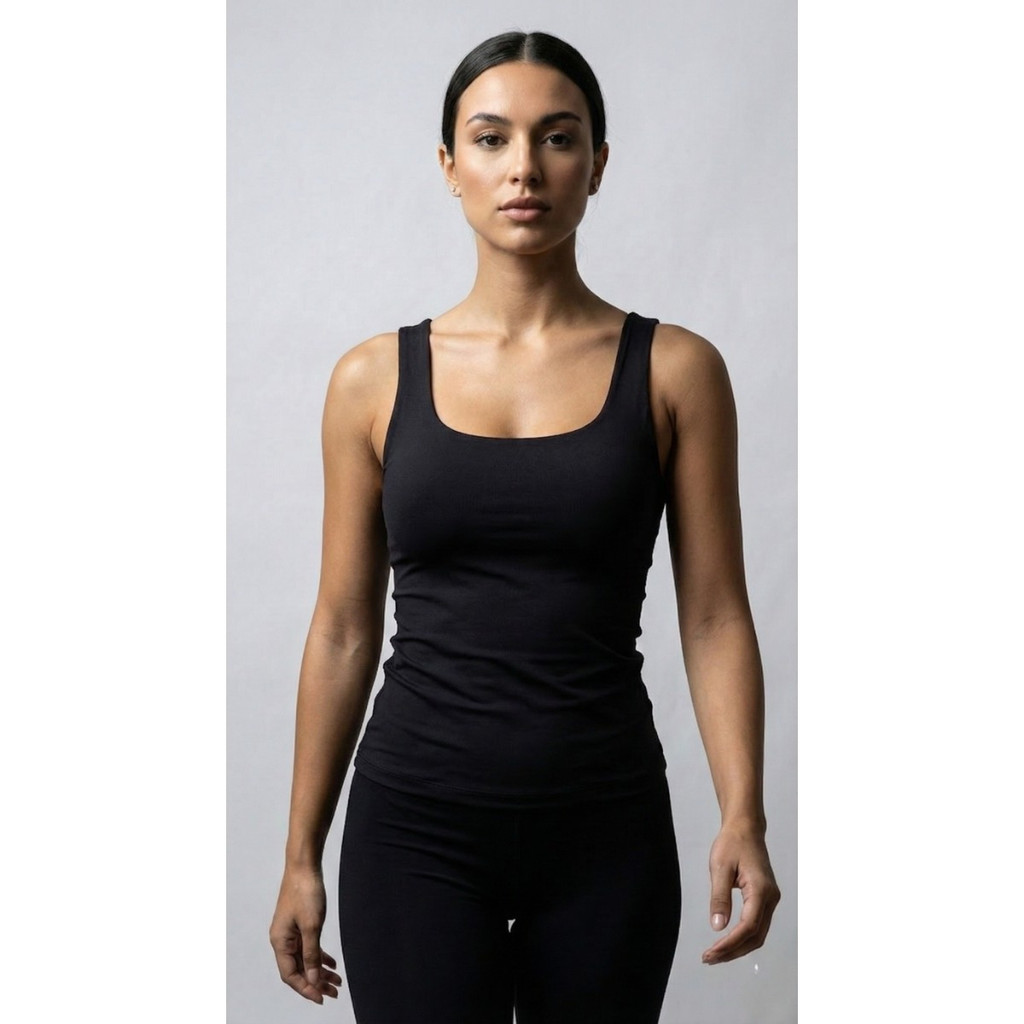 Regata Feminina Básica Preta Alça Larga Gola Quadrada Malha Poliéster com Elastano Romantic