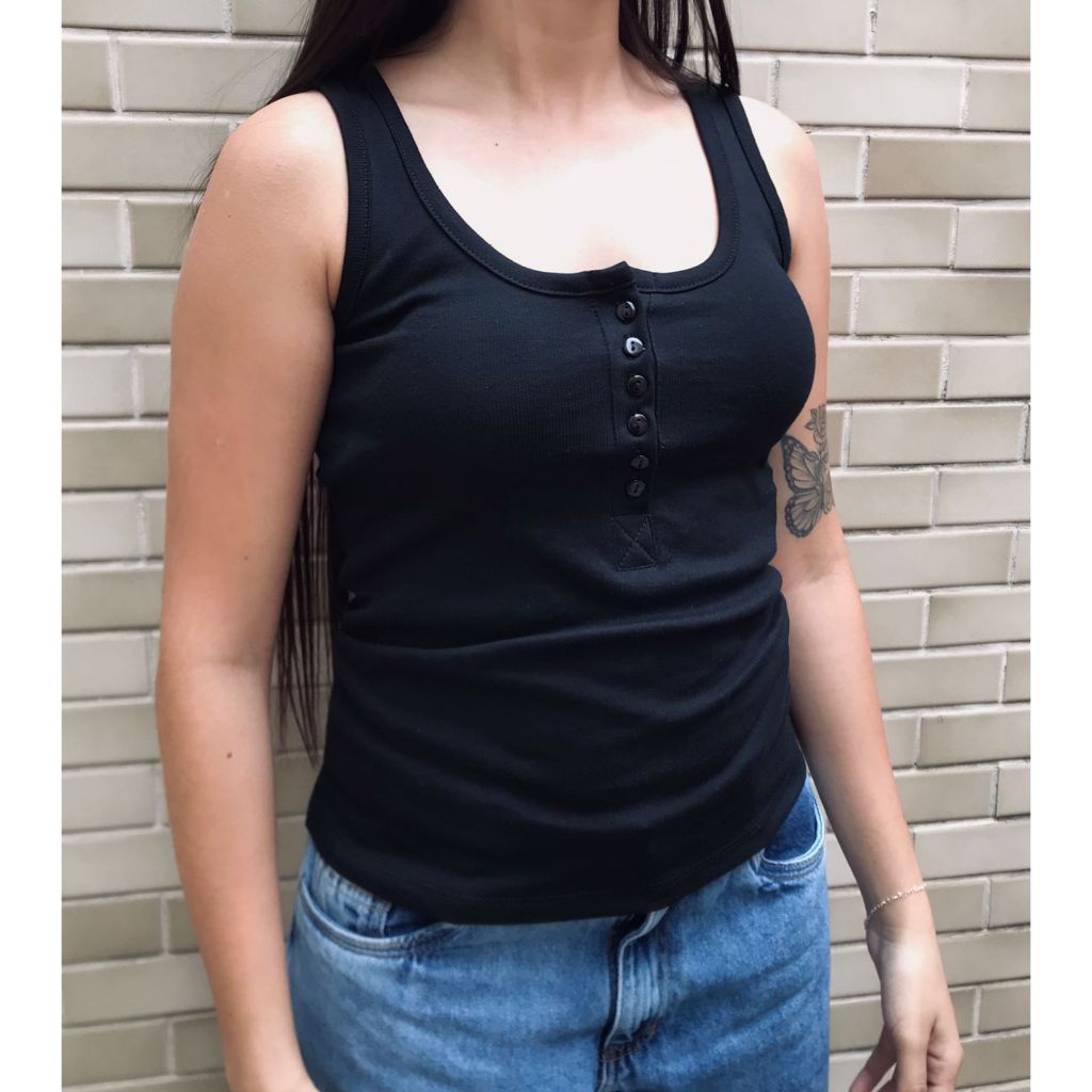 Regata Eva - Não possui bojo; - Possui detalhes de costura no canelado; -Modelo básico; - Tecido canelado; - Possui fechamento em botão; - Composição do tecido: 67% Algodão e 33% Poliéster; - Modelo em tamanho P, M, G, GG e Ex. Atenção! Os computadores e celulares usados são diferentes, com isso, podem exibir cores de formas diferentes à cor real do item, variando ligeiramente das imagens acima, devido a configuração da resolução de cada aparelho.