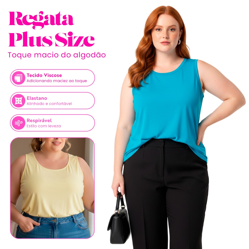 Regata Feminina Plus Size Viscose Gola Redonda Regata Básica Casual Esportiva Tecido Macio Modelagem Soltinha Transforme seu dia com nossa Regata Plus Size, cada detalhe, do tecido macio à costura cuidadosa, é pensado para realçar sua beleza natural. Esta é a peça que faltava em seu guarda-roupa, pronta para compor qualquer visual. Um Toque de Maciez Nossa viscose premium acaricia sua pele, prometendo um conforto que dura o dia todo. Uma experiência suave a cada uso. Elasticidade Amiga Com um tecido que se adapta e com modelagem soltinha. Nossa regata acompanha seu ritmo de vida ativo e seus momentos de relax. Estilo que Fala Alto O design básico ganha vida com um decote redondo favorecedor e mangas que oferecem uma cobertura elegante. É a tela em branco perfeita para seus acessórios e camadas favoritas. Versatilidade no Vestir De um café casual a uma reunião importante, a versatilidade desta regata se adapta à sua agenda. Ela é o seu convite para experimentar e expressar sua individualidade. ------------------------------------------- Tabela de Medidas Use nossa tabela de medidas para selecionar o tamanho que lhe oferece o conforto que você merece. G1 veste 48 - Comprimento: 68 cm - Busto: 120 cm - Quadril: 126 cm G2 veste 50 - Comprimento: 69 cm - Busto: 126 cm - Quadril: 132 cm G3 veste 52 - Comprimento: 70 cm - Busto: 132 cm - Quadril: 138 cm G4 veste 54 - Comprimento: 71 cm - Busto: 138 cm - Quadril: 144 cm G5 veste 56 - Comprimento: 77 cm - Busto: 142 cm - Quadril: 148 cm G6 veste 58 - Comprimento: 78 cm - Busto: 148 cm - Quadril: 154 cm G7 veste 60 - Comprimento: 79 cm - Busto: 154 cm - Quadril: 160 cm G8 veste 62 - Comprimento: 80 cm - Busto: 160 cm - Quadril: 166 cm Esta formatação destaca o tamanho da peça de roupa e o número do manequim que ela veste, proporcionando uma referência clara para te auxiliar na escolha do tamanho ideal. ------------------------------------------- Perguntas Frequentes: A regata encolhe após a lavagem? Não, nossa viscose é pré-encolhida para garantir a integridade do seu tamanho. Como devo cuidar da minha regata? Sugerimos lavar à mão ou em ciclo delicado e secar à sombra para preservar a qualidade. É adequada para climas quentes? Sim, a viscose é respirável e perfeita para manter a frescura em dias quentes. Posso trocar se não servir? Oferecemos uma política de trocas flexível para garantir sua satisfação completa. ------------------------------------------- Com nossa Regata Plus Size Viscose, você não está apenas escolhendo uma peça de roupa – você está escolhendo um companheiro de confiança para todos os momentos. Qualidade que Conquista Comprometidos com a excelência, oferecemos uma regata que mantém a cor e a forma mesmo após várias lavagens. Valorizamos seu dinheiro tanto quanto você. Adquira a sua hoje e dê o primeiro passo em direção a um conforto inigualável e estilo que fala por você.
