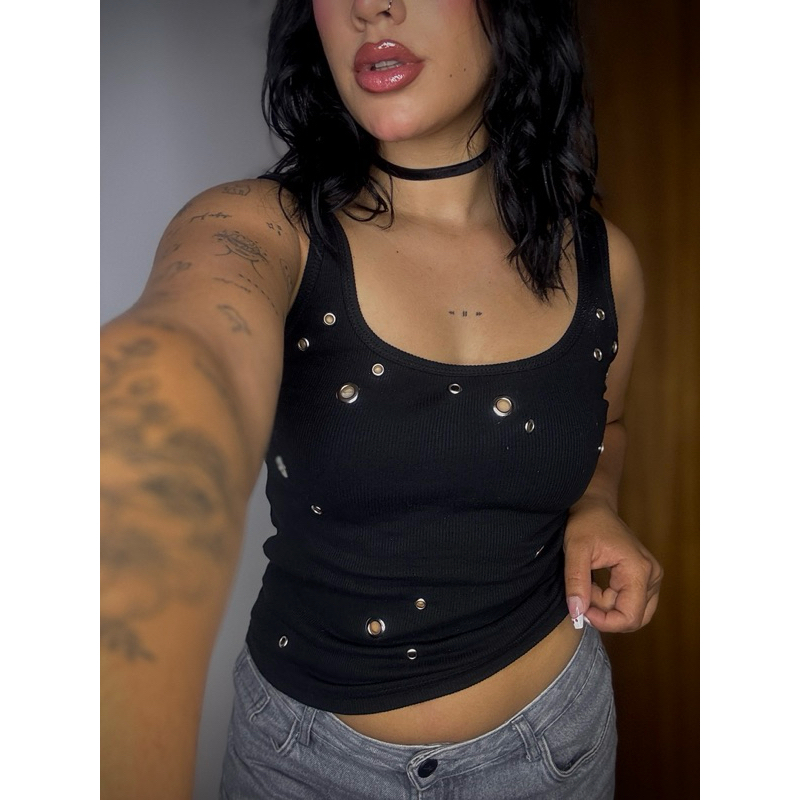 Regata Ajustada Estilo Punk Feminina Com Decoração De Rebite. 🔥 Regata preta estilo urban rocker com aplicação de ilhoses metálicos. ✨ Modelagem justa que valoriza as curvas, trazendo atitude e ousadia em cada detalhe. 👖 Combina perfeitamente com jeans, couro ou peças destroyed. ⚡ Uma peça statement pra quem gosta de se vestir com personalidade!