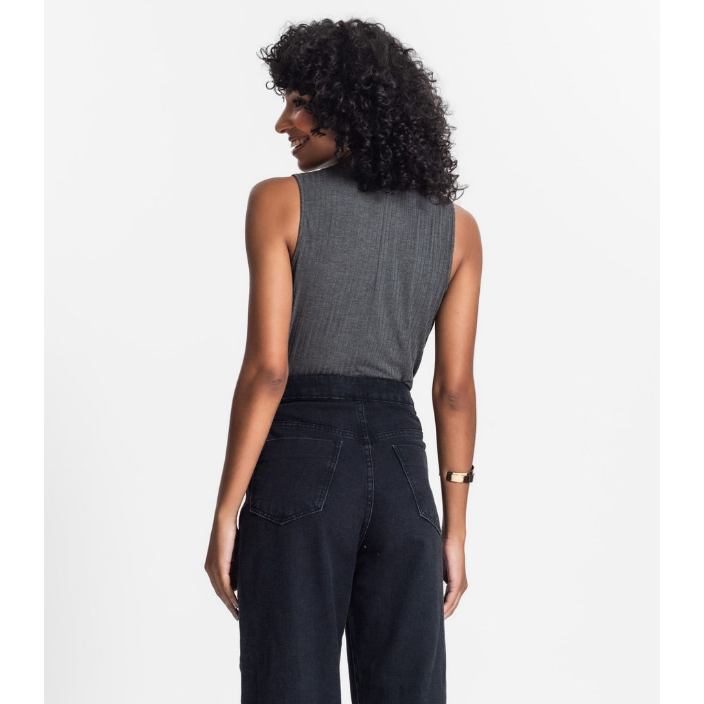 A regata confeccionada em ribana canelada é uma peça confortável e elegante. Com seu tecido macio e maleável, ela se ajusta perfeitamente ao corpo, valorizando a silhueta. A plaquinha de metal, um detalhe sofisticado, adiciona um toque de glamour à peça. Versátil, a regata pode ser combinada com diversas peças, desde calças jeans até saias mais sofisticadas, e é ideal para diversas ocasiões, desde um passeio no parque até um jantar elegante.