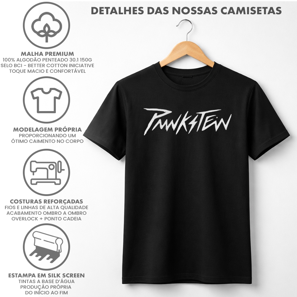 Produzido por Punkstein Malha penteada 150g Algodão Sustentável. Certificado BCI Modelagem Própria | Caimento nos ombros | Golas com reforço. . Feito no Brasil (SJC-SP) Composição: Malha preta ou branca: 100% algodão penteado 30.1 | Malha jaguar ou mescla: 60% algodão, 40% poliéster Estampa em Silk Screen manual. Tintas a base d'água. Confira a Tabela de Medidas e compare com uma peça sua para escolher o tamanho ideal para você. Considere que o algodão por ser uma fibra natural sofre encolhimento após a primeira lavagem. Malhas 100% algodão: em média até 3%