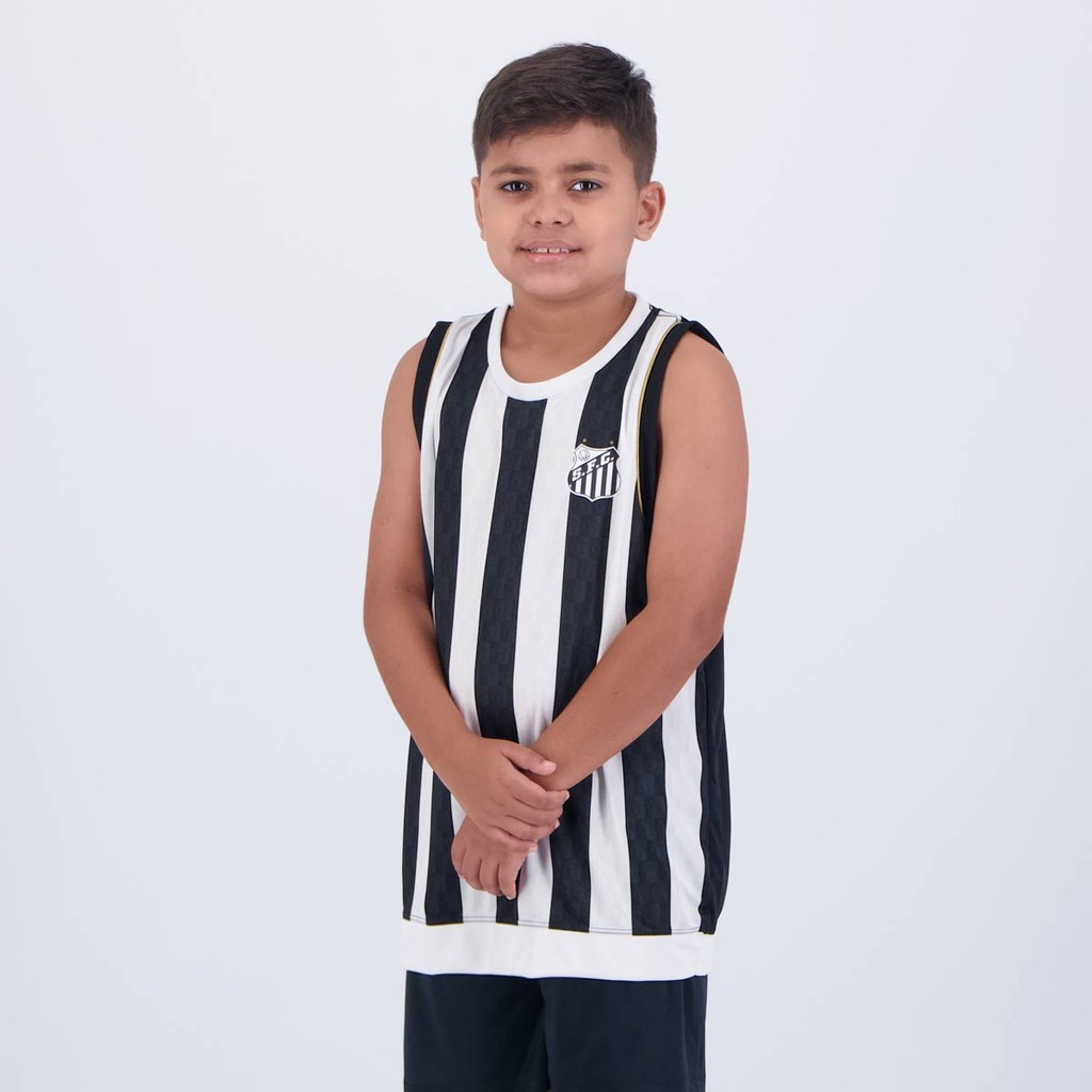 Composição: 100% PoliésterCores predominantes: Preta e BrancaIndicada para: CasualOrigem: NacionalIdade: InfantilClube: SantosManga: RegataGola: CarecaDimensões aproximadas (A x L):04 ANOS: 46 x 32 cm06 ANOS: 48 x 34 cm08 ANOS: 50 x 36 cm10 ANOS: 52 x 38 cm12 ANOS: 54 x 40 cm
