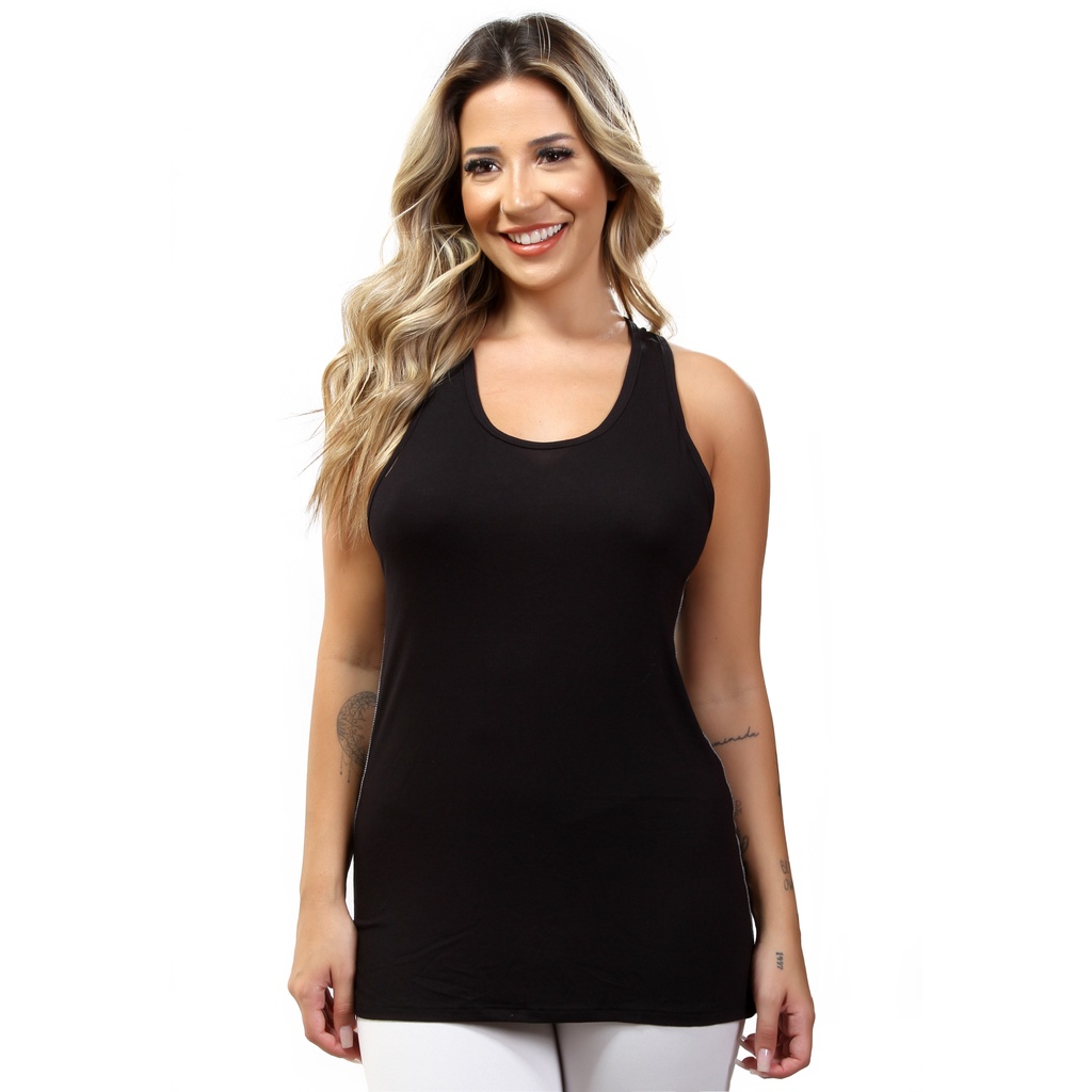 REF:10682 Regata fitness 10682 Tapa BumBum Composição: 96% viscolaycra 4% Elastano Essa Blusa com a gola redonda na frente e nas costas alças mais largas formando um lindo detalhe, super fresquinha. A blusa tem muito conforto para suas atividades físicas e no dia dia.