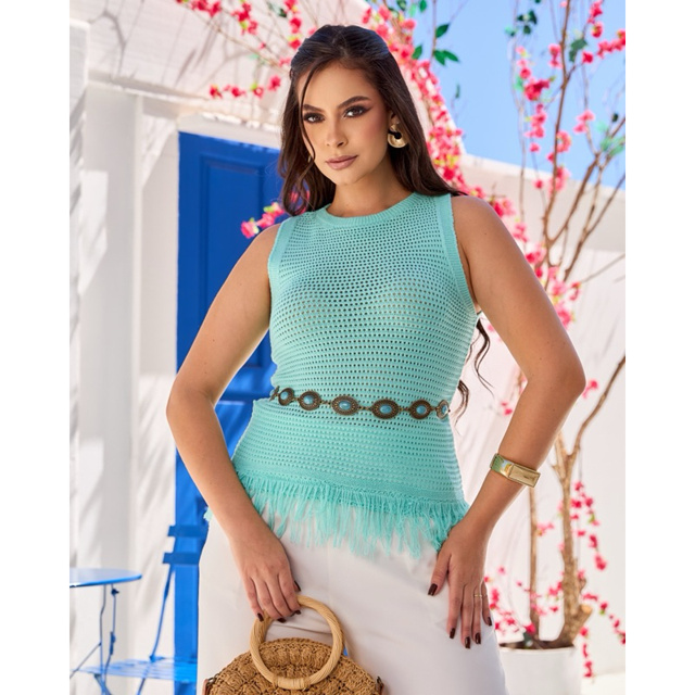 Regata vazada com franjas feita no tricô modal, primavera verão.