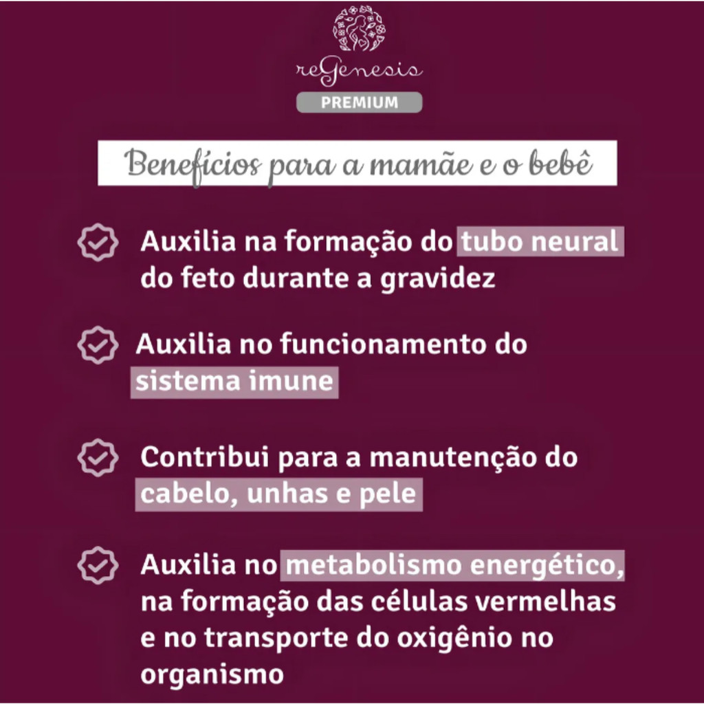 O que é o ReGenesis Premium com Lipinova? Regenesis Premium é um suplemento alimentar em cápsulas voltado para gestantes. É rico em Metilfolato (a forma ativa do ácido fólico), que auxilia na formação do tubo neural do feto durante a gravidez, contribuindo para o desenvolvimento saudável do organismo do futuro bebê. Também contém selênio, um antioxidante que auxilia na proteção dos danos causados pelos radicais livres. O que são radicais livres? São moléculas liberadas pelo metabolismo do corpo, e igualmente combatidas pelo organismo a partir de uma produção natural de enzimas. Entretanto, essa produção de enzimas diminui com o passar do tempo, favorecendo o acúmulo de radicais livres, os quais provocam a degradação do colágeno e o consequente envelhecimento da pele. Para que serve o suplemento alimentar ReGenesis Premium com Lipinova? É indicado para as gestantes como opção de suplementação alimentar para contribuir com a boa formação do bebê. Regenesis Premium possui alta concentração de Ômega 3 DHA (600mg), Metifolato, 2000UI de vitamina d, Ferro e mais outras 13 vitaminas e minerais, em uma fórmula sem adição de açúcar. Para a mamãe, ajuda no fortalecimento do sistema imune e potencializa o metabolismo energético. E para o neném auxilia no desenvolvimento neurológico e das células vermelhas, divisão e diferenciação celular e um grande reforço para o desenvolvimento do sistema osseo. Benefícios e diferenciais do ReGenesis Premium com Lipinova Suplemento alimentar em cápsulas. Indicado para gestantes. Rico em Metilfolato (forma ativa do ácido fólico). Auxilia na formação do tubo neural do feto durante a gravidez. Contribui para o desenvolvimento saudável do organismo do futuro bebê. Contém selênio, antioxidante que combate os danos causados pelos radicais livres. Sem adição de açúcar. Como usar o suplemento alimentar ReGenesis Premium? Ingerir 2 cápsulas ao dia ou conforme a orientação do médico e/ou nutricionista. Qual o melhor horário para tomar o Regenesis Premium? Regenesis premium pode ser tomado em qualquer horário do dia, mas recomendamos ingeri-lo 15 minutos antes das refeições, para não interferir na digestão saudável dos alimentos. Consulte o médico para mais orientações. Ingredientes Óleo De Peixe (Ômega 3), Óxido De Magnésio, Furamato Ferroso, Ácido Arscórbico, Niocotinamida, Acetato De Racealfatocoferol, Óxido De Zinco, Óleo De Sejoa, Pantotenato De Cálcio, Sulfato De Manganês, Cianocobalamina, Cloridrato De Piridoxina, Nitrato De Tiamina, Riboflavina, Óxido Cúprico, Selenitro De Sódio, Ácido Fólico, Iodeto De Potássio, Biotina E Emulsificante Lecitina De Soja. Cápsula Gelificante Gelatina, Umectante Glicerol, Glaceante Cera De Abelha, Água Purificada, Corantes Óxido De Ferro Amarelo, Óxido De Ferro Preto, Vermelho Bordeaux S E Vermelho Cochonilha. Alérgicos Zero açúcar, glúten e lactose. Contém derivados de peixe e soja. Pode conter derivados de amendoim. Zero açúcar. Advertências Consulte o médico antes de utilizar o produto. Guarde em local fresco e seco (15ºC a 30ºC). Se houver sintomas, suspenda o uso imediatamente e procure orientação médica. Mantenha fora do alcance das crianças.