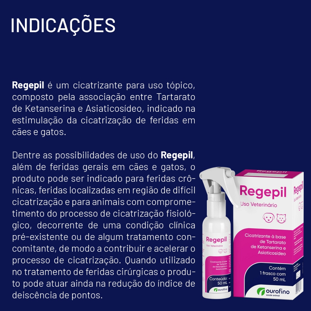 ____________________________________________________________________________ A nossa loja está a mais de 10 anos no mercado, com produtos originais e com nota fiscal. Indicações: Regepil um cicatrizante para uso típico, composto pelas associações entre Tartarato de Ketanserina e Asiaticosdeo, indicado na estimulação da cicatrização de feridas em cães e gatos. Dentre as possibilidades de uso do Regepil, além de feridas gerais em cães e gatos, o produto pode ser indicado para feridas crônicas, feridas localizadas em regiões de difícil cicatriza o e para animais com comprometimento do processo de cicatriza o fisiológico, decorrente de uma condição clinica pré-existente ou de algum tratamento concomitante, de modo a contribuir e acelerar o processo de cicatrização. Quando utilizado no tratamento de feridas cirúrgicas o produto pode atuar ainda na redução do índice de deiscências de pontos. A eficácia desse produto no foi avaliada pelo Ministério da Agricultura, Pecuária e Abastecimento, por foram conduzidos estudos pela empresa fabricante que demonstraram que o produto apresenta as características desejadas e necessárias de eficácia e segurana para a indicação o a que se destina obtendo, dessa forma, emissão de Licença Provisória. Dosagem: Regepil deve ser aplicado sobre a região a ser cicatrizada, em quantidade suficiente para que toda a superfície e bordas da ferida recebam o produto. O produto deve ser aplicado diariamente, por até 3 vezes ao dia, ou nos momentos de manipulação da ferida para higienização e/ou troca de curativo. O tratamento deve ser continuado até a completa cicatrização da ferida. Na região tratada, ocasionalmente, pode ser observada a formação de uma película, decorrente do uso do produto. O intervalo entre aplicações do produto Regepil variável de acordo com o tipo de ferida e com as condições da região a ser cicatrizada, ficando a critério do médico-veterinário a definição do intervalo entre doses, de acordo com o protocolo de tratamento estabelecido. Modo de uso: Regepil acompanha uma válvula spray, que deve ser acoplada ao frasco, perfurando o lacre, previamente ao uso, para a correta aplicação do produto. Para acoplar a válvula da forma correta siga os passos: Retire o frasco e a válvula spray da embalagem; Retire a tampa do frasco; Em seguida posicione a válvula spray perpendicularmente ao frasco e, com a própria haste de plástico, perfure o lacre de proteção com um movimento para baixo; Enrosque bem a válvula spray para que não haja vazamento do produto durante a aplicação; Para sua segurana a válvula spray enviada na posição de travamento; Para o uso gire a trava para a posição “Open” conforme indicado na ilustração. Lavar a ferida com solução fisiológica, removendo qualquer corpo estranho, tecido necrótico ou tecido de hiper granulação existente, antes de cada aplicação do produto. Em caso de sangramento da ferida, recomendado que a aplicação do produto seja realizada apenas após o sangramento ter cessado. Aplicar o produto sobre a região a ser cicatrizada, movimentando o frasco para que a aplicação aconteça em toda a área da ferida. Aplicar em quantidade suficiente para que toda a superfície e bordas da ferida recebam o produto. Após a aplicação do produto, lavar as mãos com água e sabão. O uso do produto no requer a manuteno de curativos ou a restrição de movimentação de membros, de modo que o uso de curativos, bem como a sua manuteno, e o manejo do animal durante o tratamento da ferida devem ser orientados pelo médico-veterinário. Para a correta evoluo do processo de cicatrização de feridas são necessários cuidados especiais, a fim de proteger a região a ser cicatrizada de eventuais lambeduras, mordeduras e arranhaduras, que podem interferir negativamente no tratamento da ferida. Recomenda-se, por exemplo, o uso de colar elisabetano. Fórmula: Cada 100 ml contém: Tartarato de Ketanserina ........... 0,345 g Asiaticosdeo ........... 0,200 g Veculo q.s.p. ........... 100,00 ml ____________________________________________________________________________ Gostou? Não perca tempo, garanta já o seu!