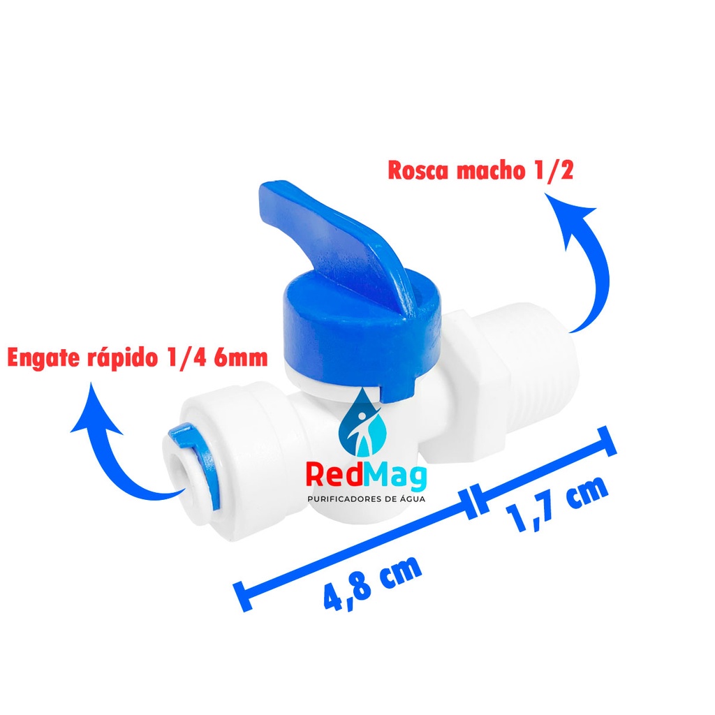 Registro Plastico P/ Filtro De Agua Mangueira 1/4 Rosca 1/2 Registros em linha para mangueira de 1/4 (6 mm) recomendado para purificadores de água que possuem entrada de mangueira 1/4, solução para locais onde o ponto de água não possui registro fixo para o bebedouro ou purificador. Muito fácil instalação, facilita a limpeza de seu purificador no momento que precisar fechar a água de entrada, pode ser usado também como redutor de Vazão devido ao seu modo de Regulagem.Com o engate rápido, basta plugar a mangueira.Os conectores para conexão rápida oferecem as seguintes vantagens:• Conexão e desconexão rápida, sem necessidade de uso de ferramentas.• Também apropriados para conectar tubos de metal.• Suportam uma pressão de trabalho de até 10 Kgf/cm2 a 20ºC e de 4 Kgf/cm2 a 60ºC.• Proporcionam uma conexão segura e sem vazamentos.• São fornecidos na cor branca.• Fabricado com material atóxicoContém:1 Registros engate rápido 1/4 x Rosca externa de ½”