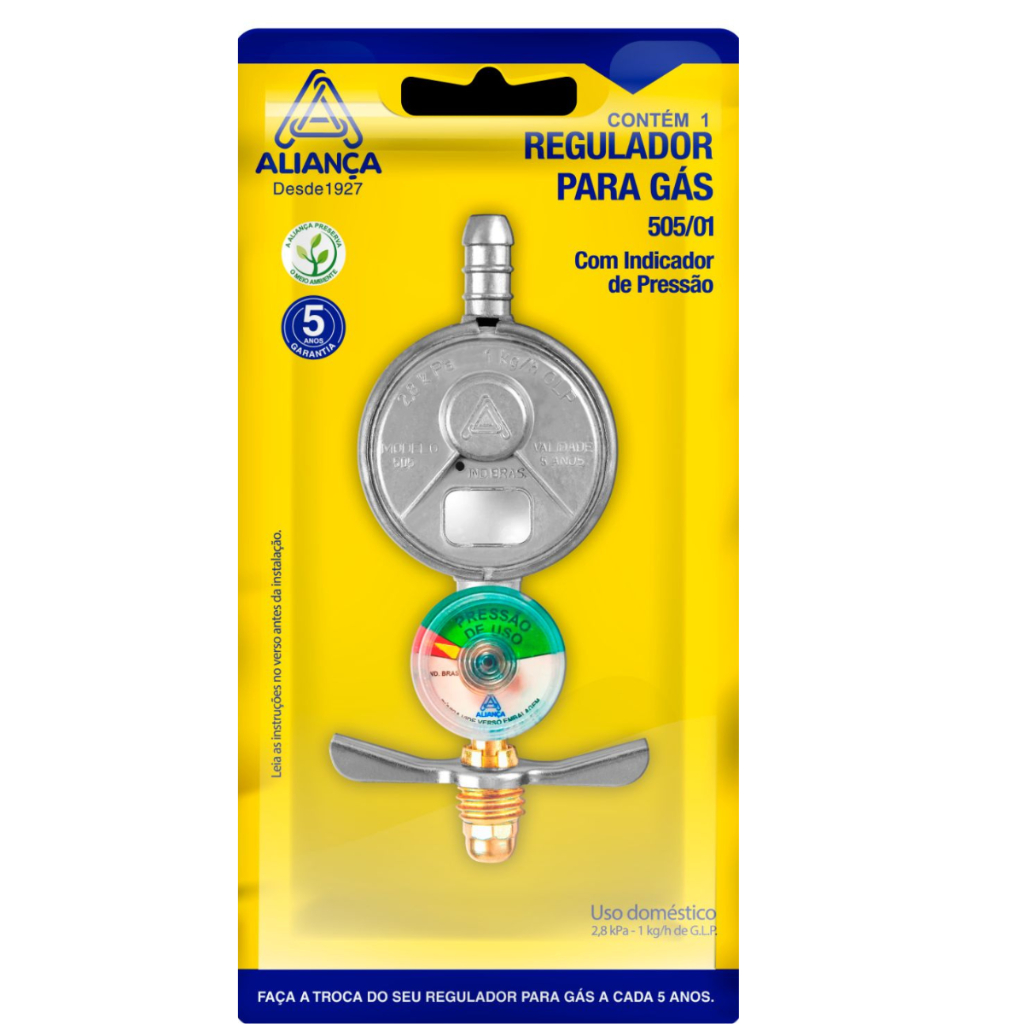 KIT COMPLETO: 1 - REGULADOR DE GÁS ALIANÇA 505/01 COM MANOMETRO 1 - MANGUEIRA CORTADA NA METRAGEM 2,00MT 2 - ABRAÇADEIRAS ROSCA SEM FIM Regulador de gás Indicado para regular a pressão de saída em botijões de até 13 kg. Uso doméstico. Modelo do regulador de gás: Parafusado Vazão máxima do regulador de gás: 1 kg/hora Rosca de entrada do regulador de gás: Padrão botijão P13 Conexão de saída do regulador de gás: Espigão ATENÇÃO: Jamais utilizar qualquer tipo de ferramenta para apertar a borboleta. Foto do título meramente ilustrativa * Ficha técnica Marca: Aliança Modelo: 505/01 com Manômetro Material: ZAMAC Linha: DOMÉSTICO 1KG/H Pe: 7 bar Ps: 2,8 kpa Vazão Kg/h: 1 Ce: borb. P13 Cs: 3/8" BM Tipo: N/D ATENÇÃO: * O Indicador de Pressão não mede a quantidade de gás e sim indica dentro da escala verde "Pressão de Uso", independente da posição do ponteiro, se a pressão está adequada para o uso. (A pressão dentro do botijão varia conforme a composição do GLP (Propano/Butano), temperatura ambiente e volume interno). Produto Original QUALQUER DÚVIDA ESTAMOS À DISPOSIÇÃO PARA ESCLARECER TIRE TODAS AS SUAS DÚVIDAS ANTES DE EFETUAR A COMPRA